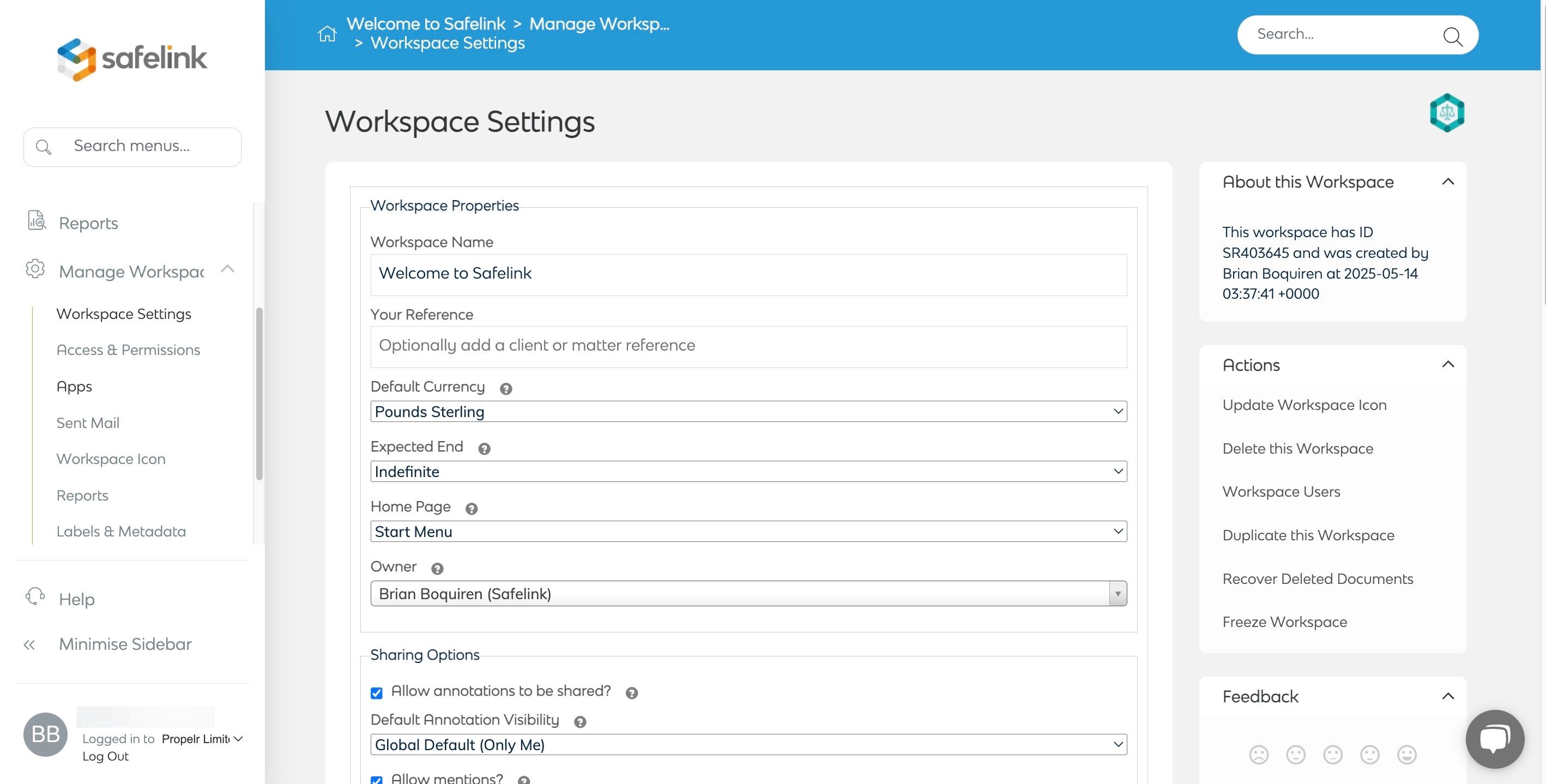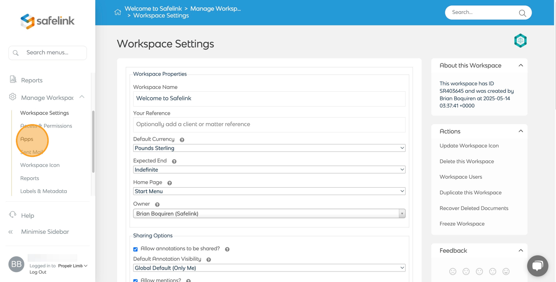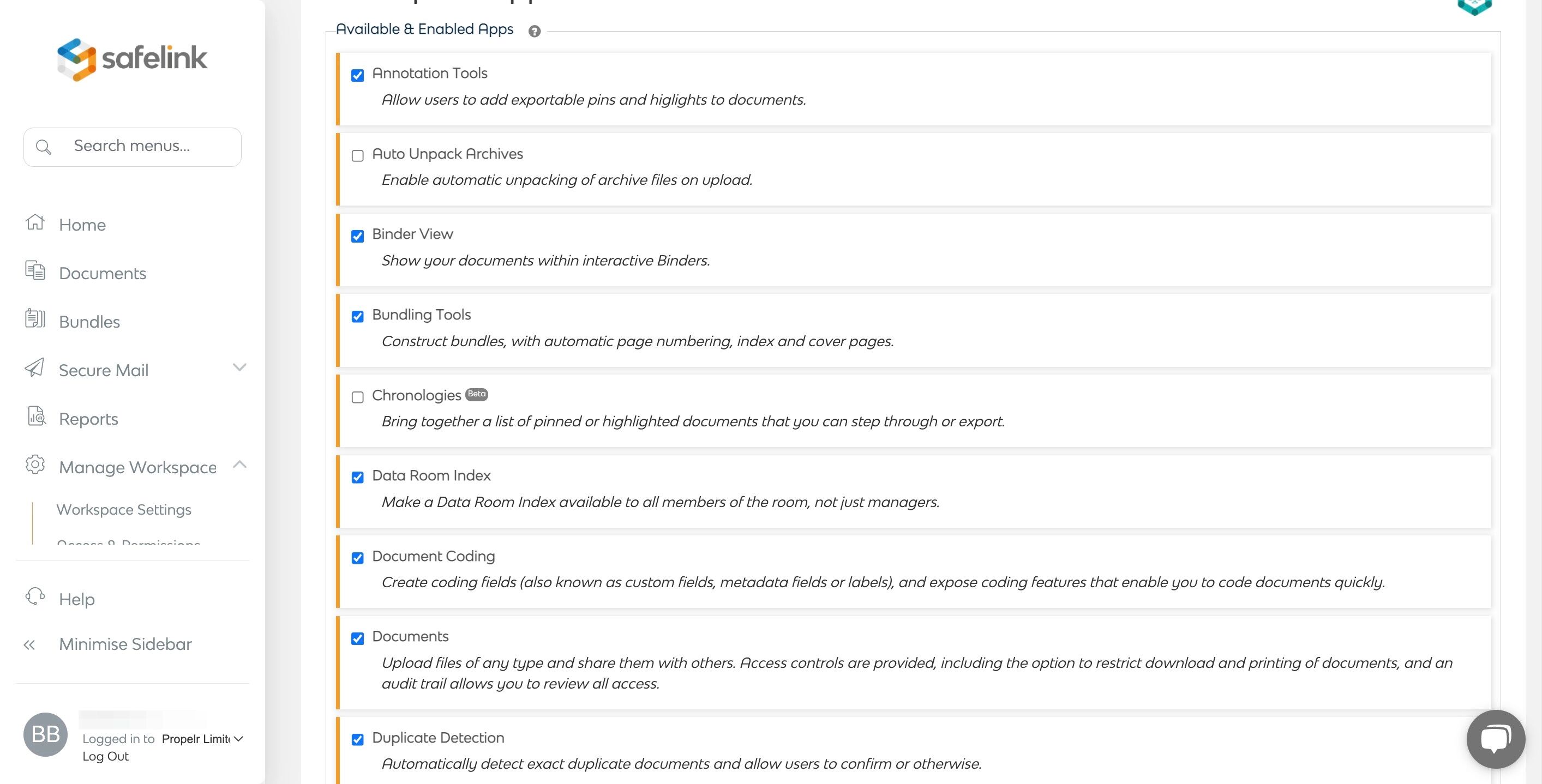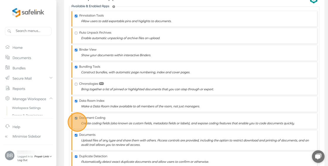 - To turn on the document coding app, click Manage Workspace to view your workspace settings.