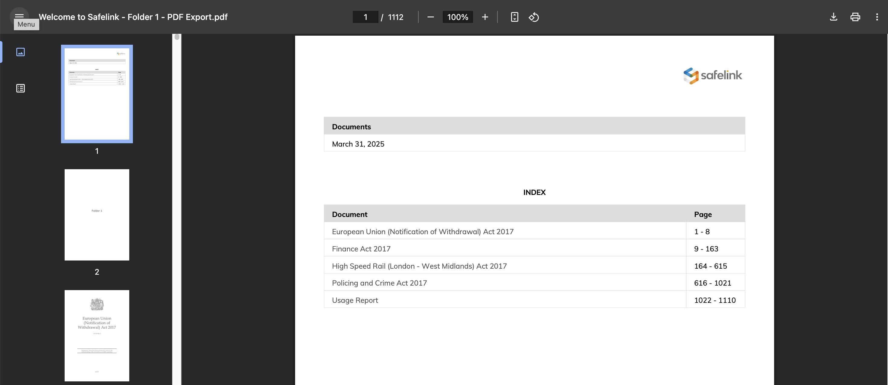 Safelink can build a single PDF file containing all the documents in a folder. You can add an index page and number the pages. Make sure you have folder admin permissions enabled to download folders and documents.