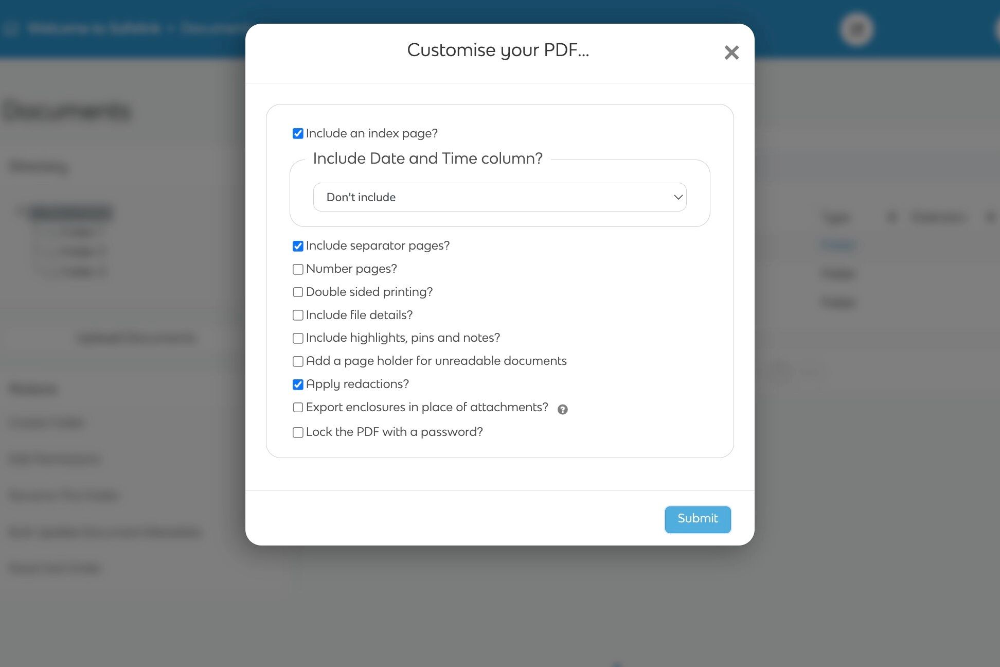 - Before you download your PDF, you can customise it. Select the PDF options relevant to you, then click Continue.