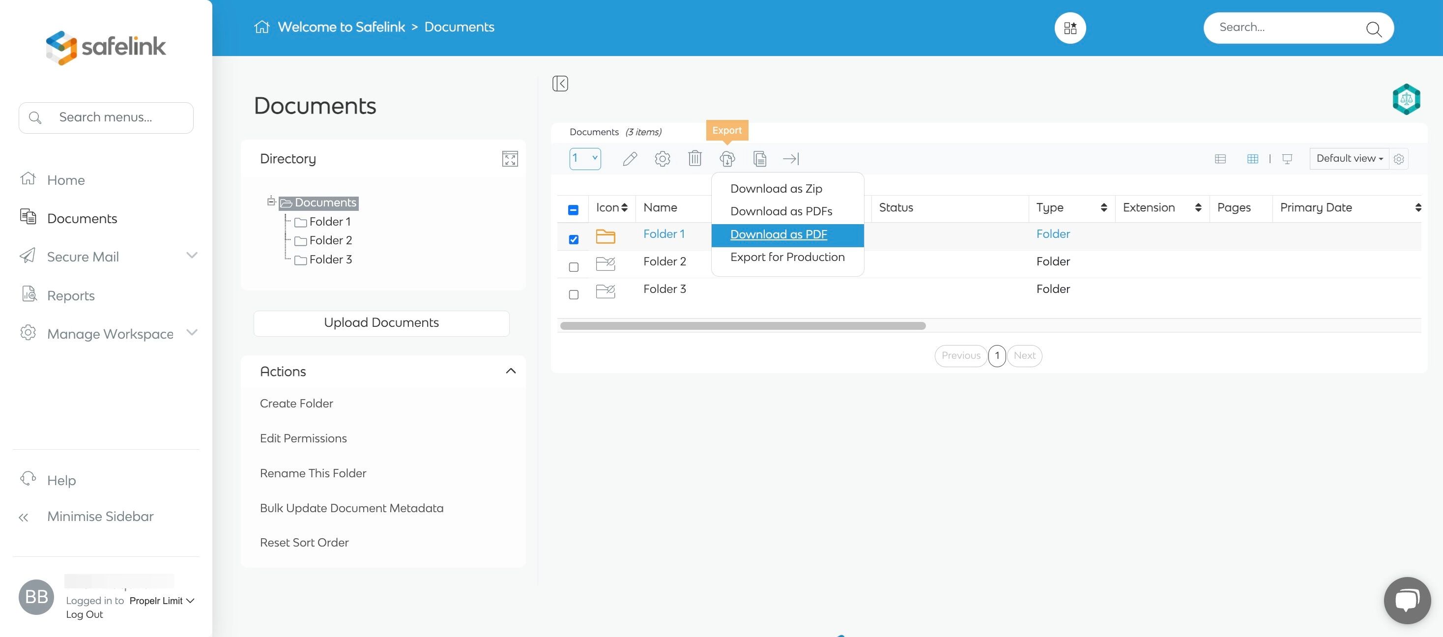 Please note that all the documents in the subfolders will also be included. - Click the Export button from the Actions Toolbar and select Download as PDF.