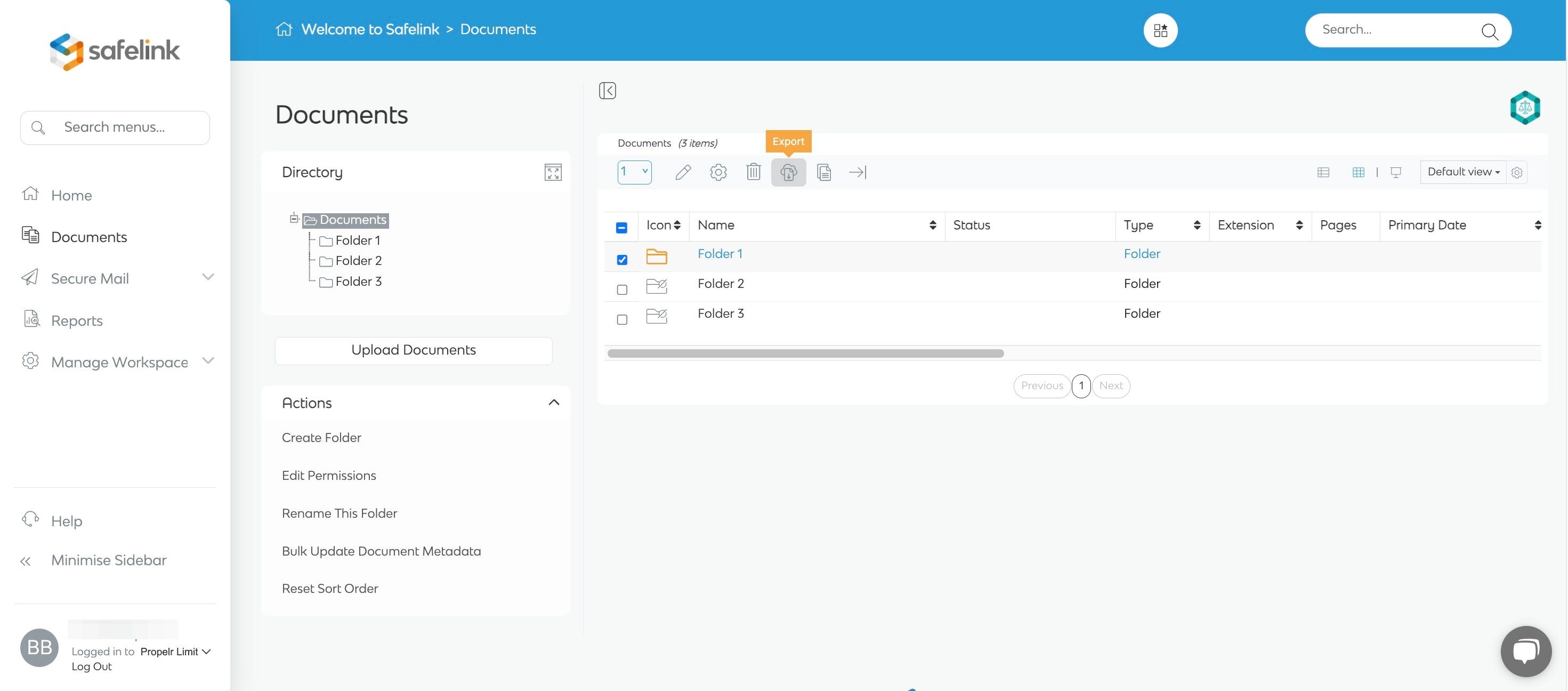 Please note that all the documents in the subfolders will be included. - Click the Export button from the Actions Toolbar.