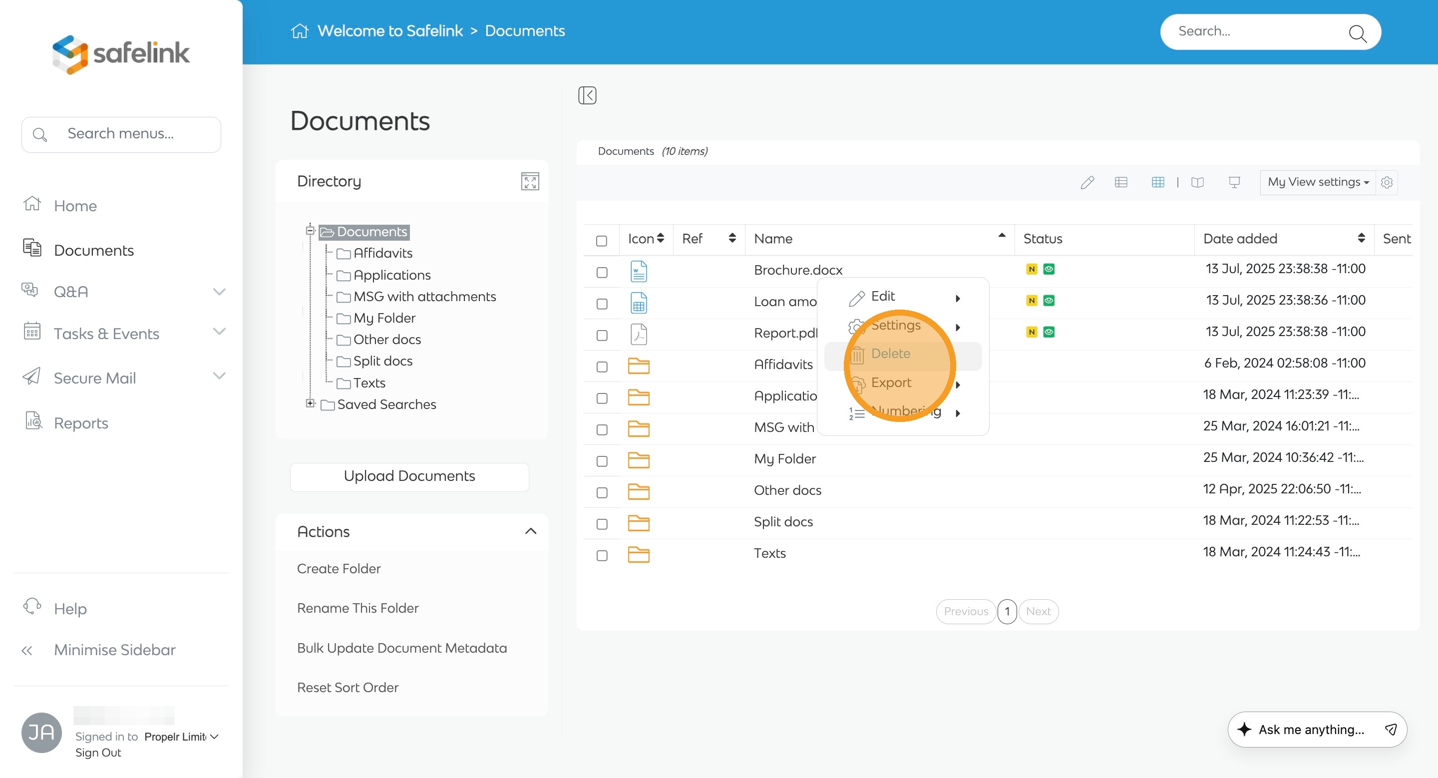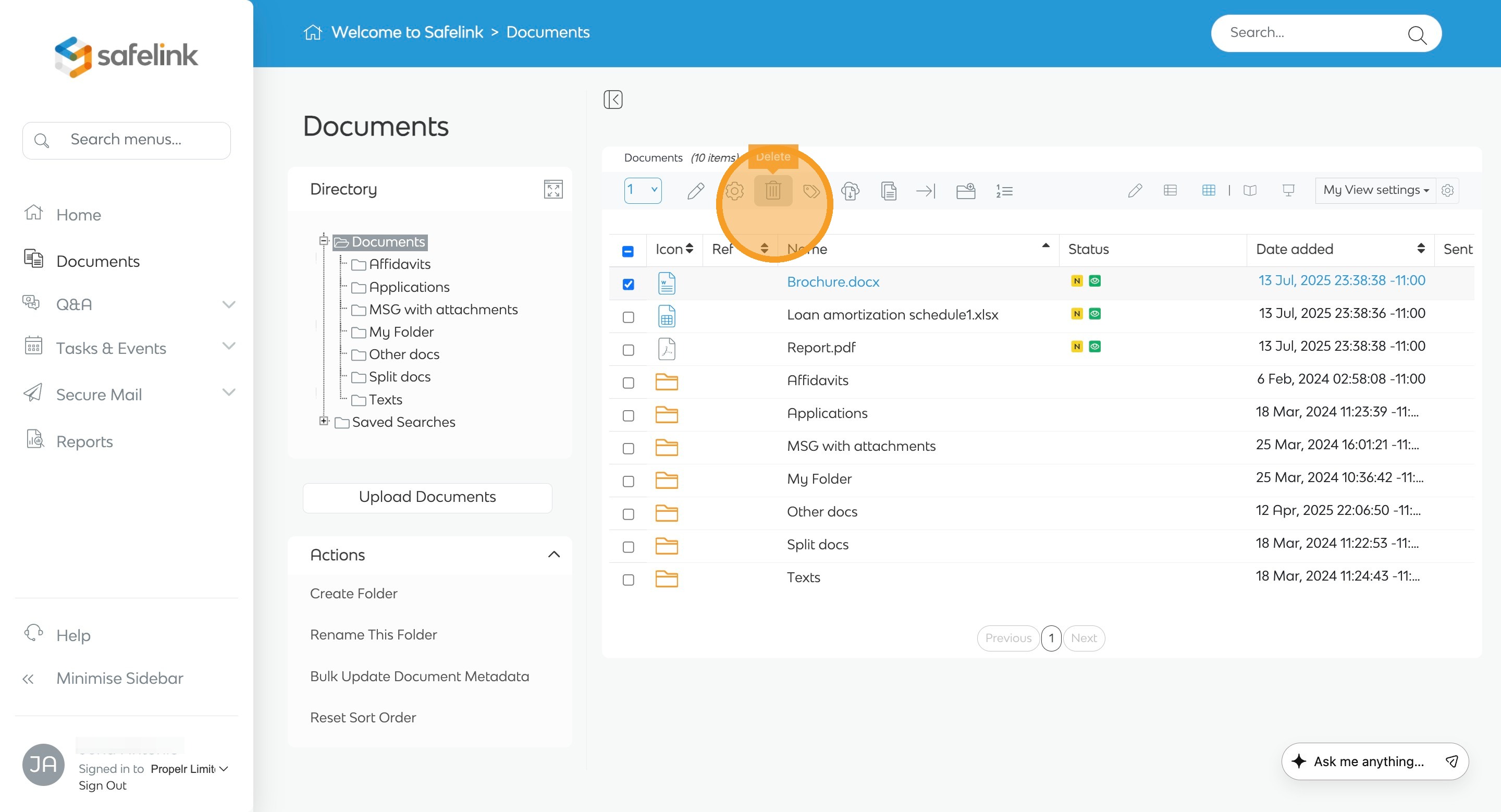 Note: You can also right-click the document and select delete from the menu in List View mode.