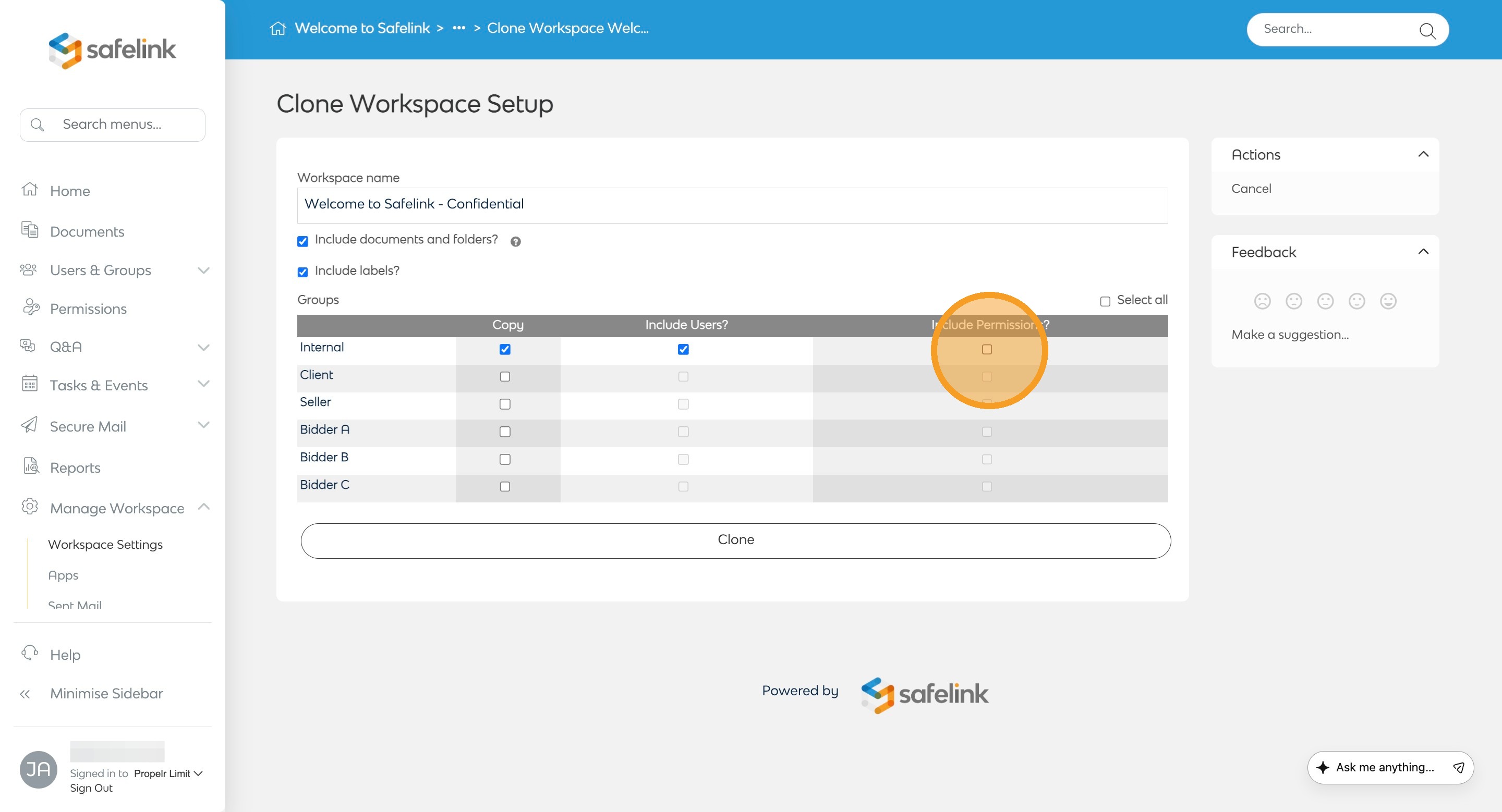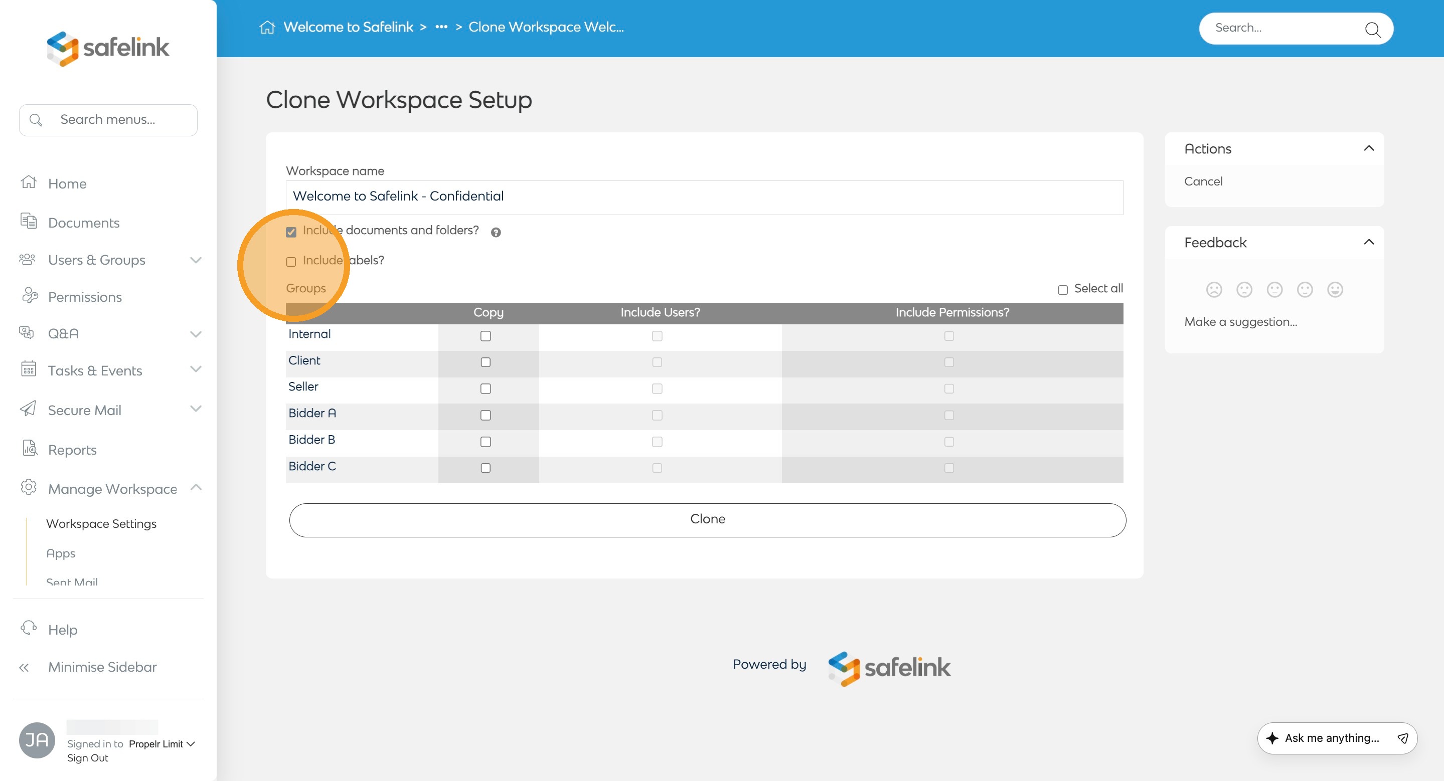 - Tick Include labels? if you have created labels for your documents and would like to include them in the duplicated workspace.