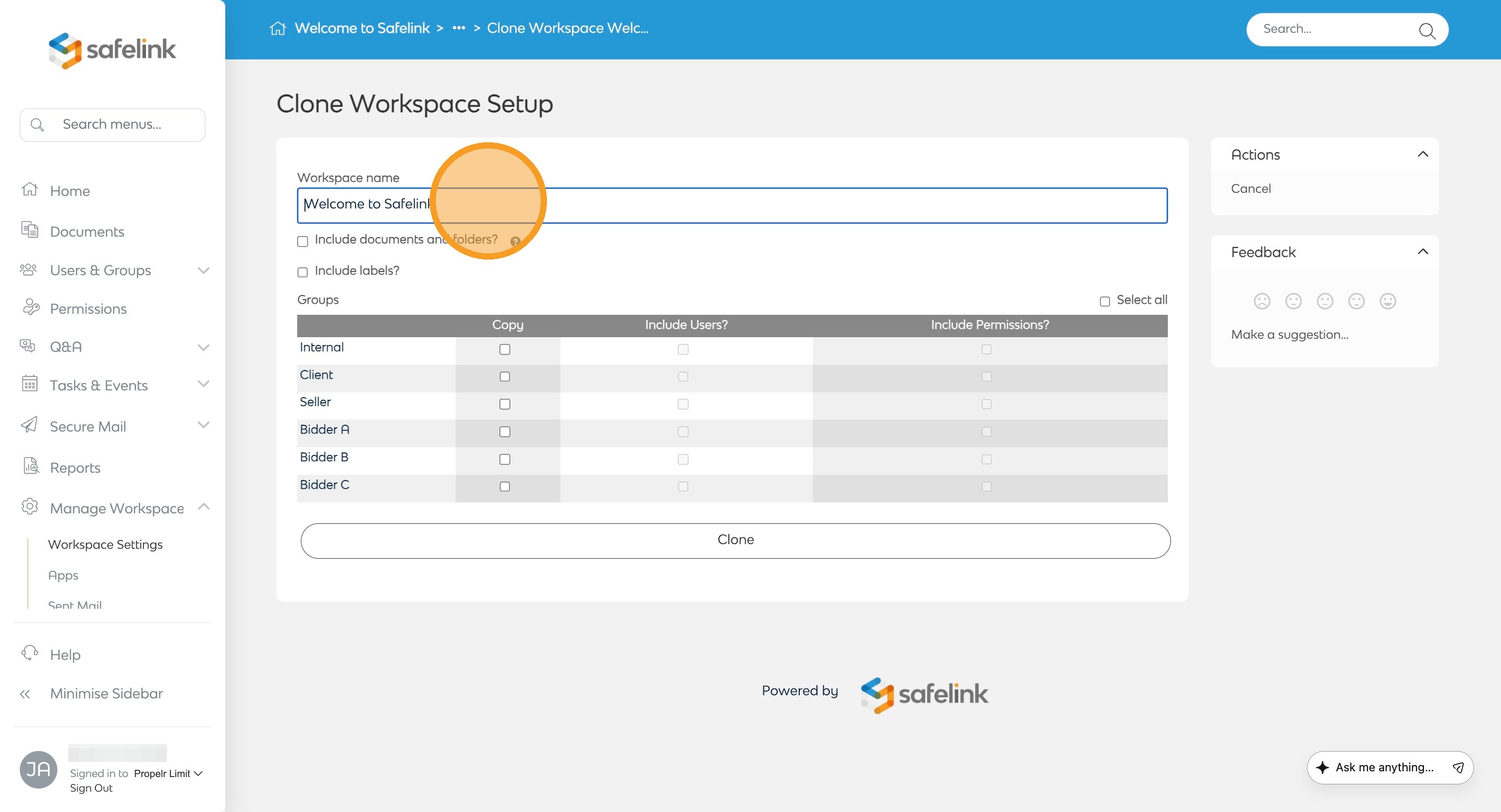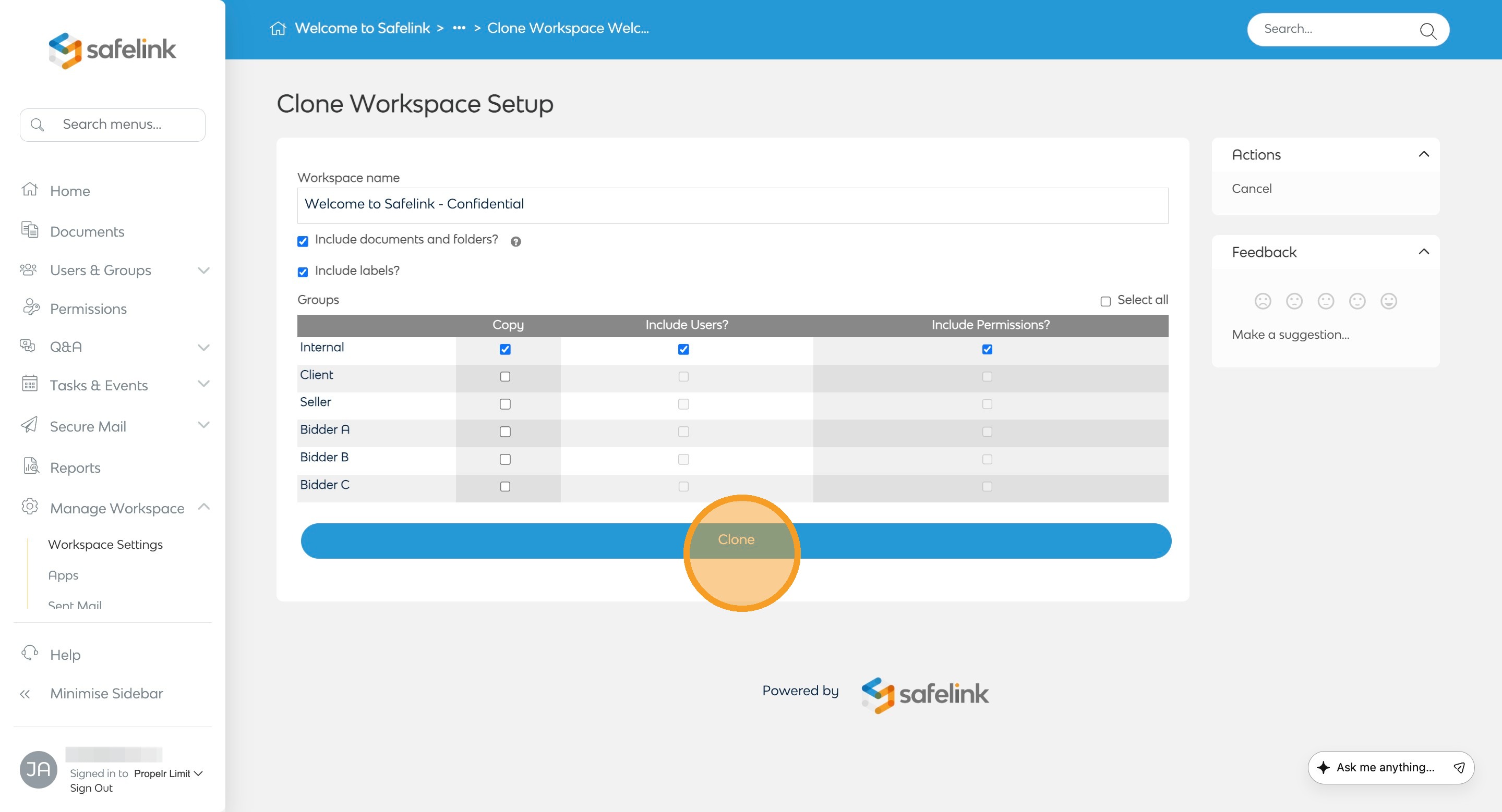 - Click Clone to duplicate your workspace.
