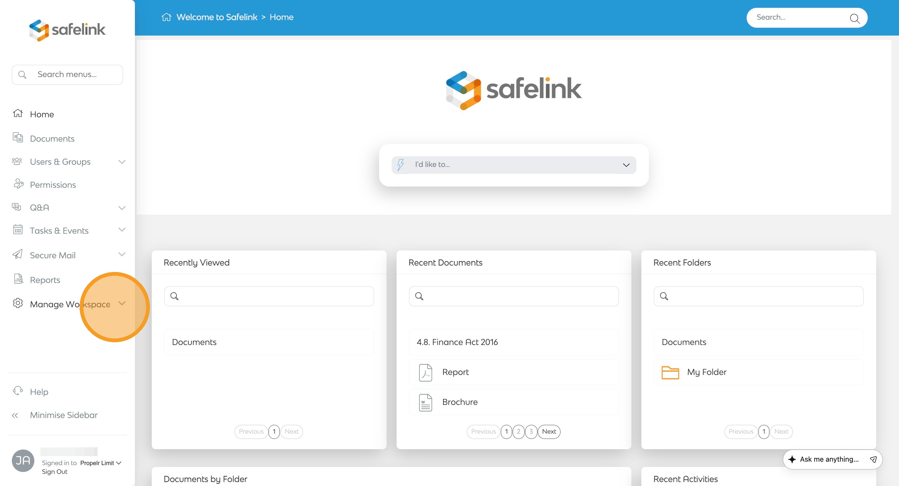 - Click Manage Workspace.