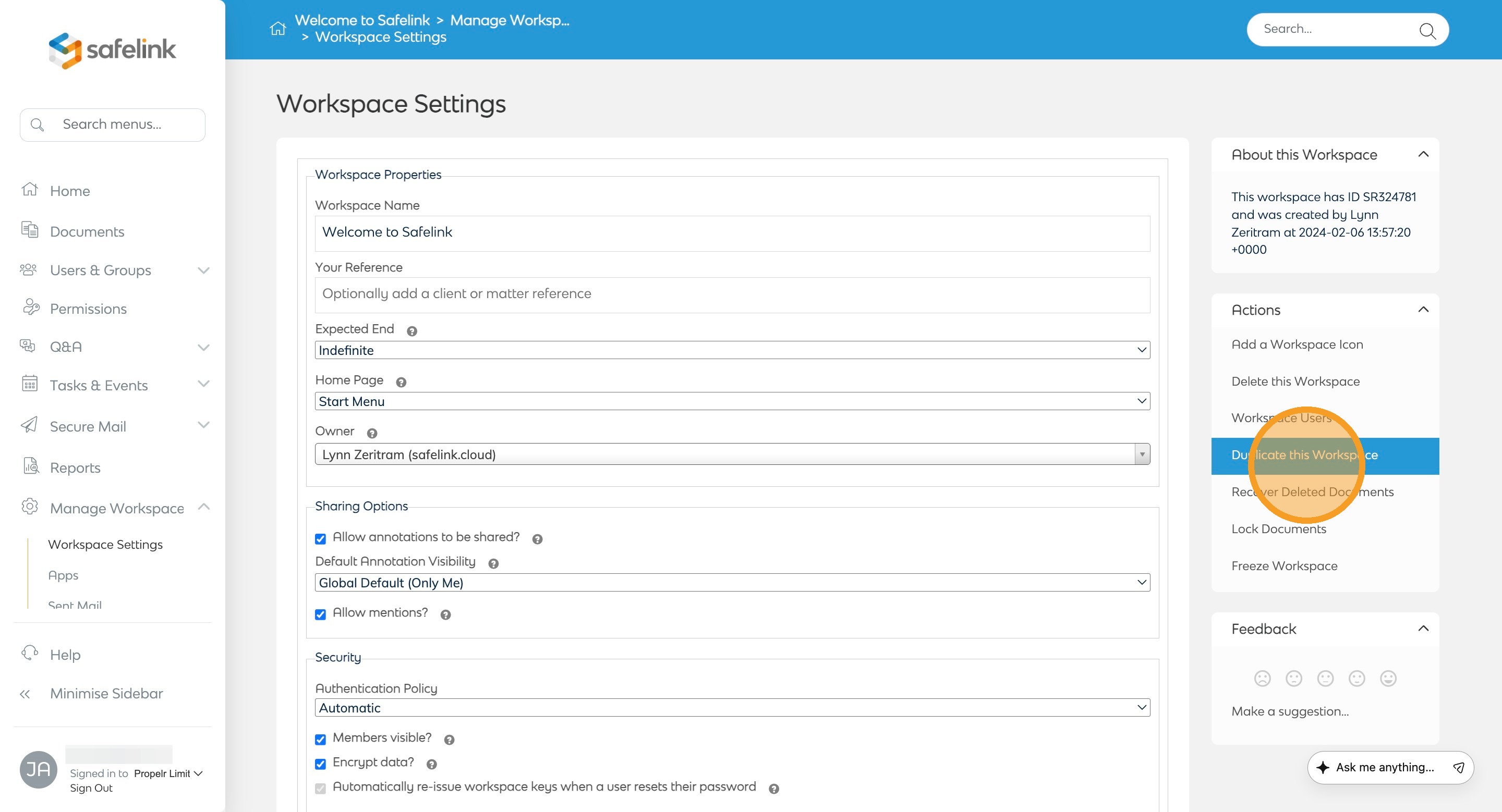 - Click Duplicate this Workspace on the Actions Menu to the right.