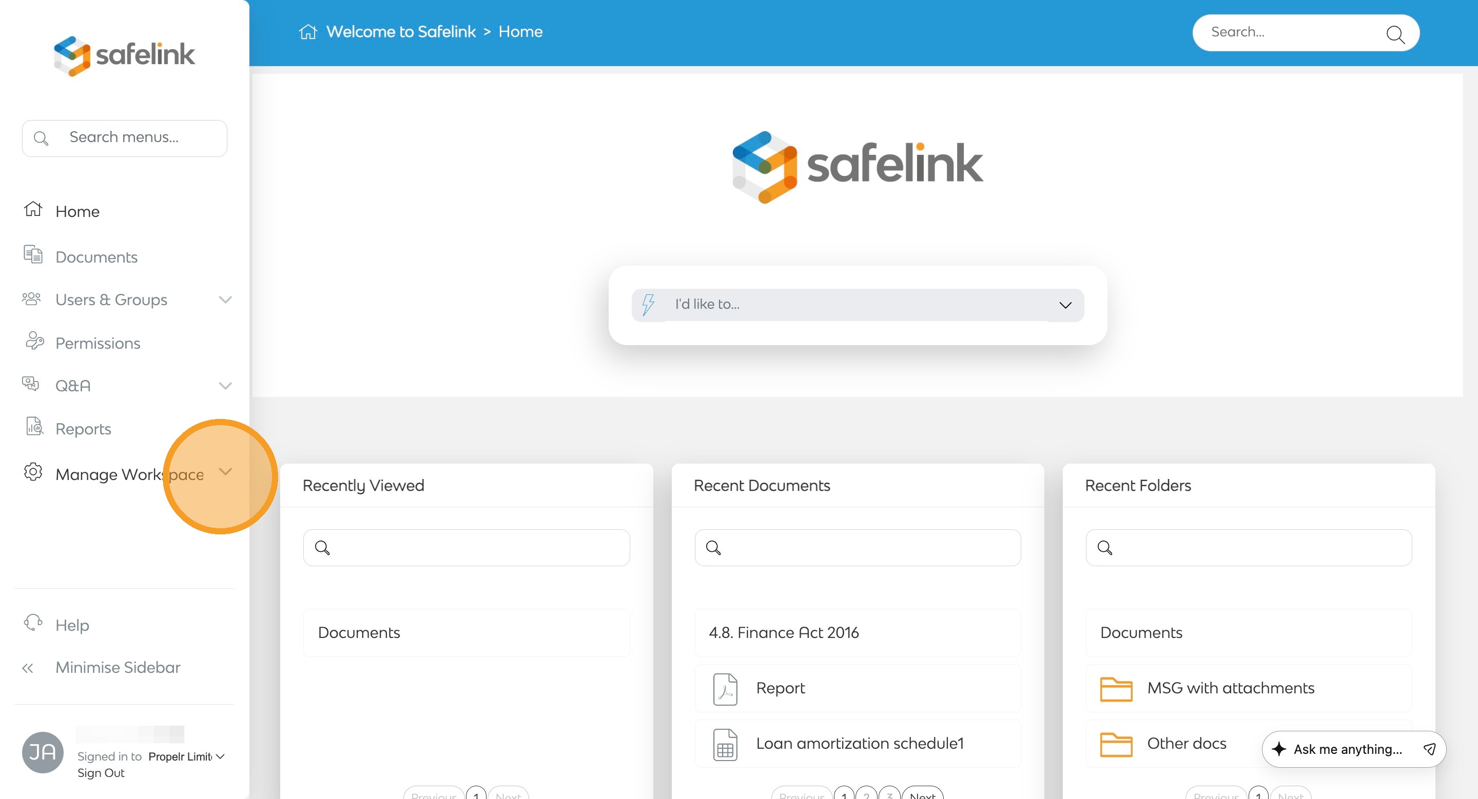 - Open your workspace and click Manage Workspace.