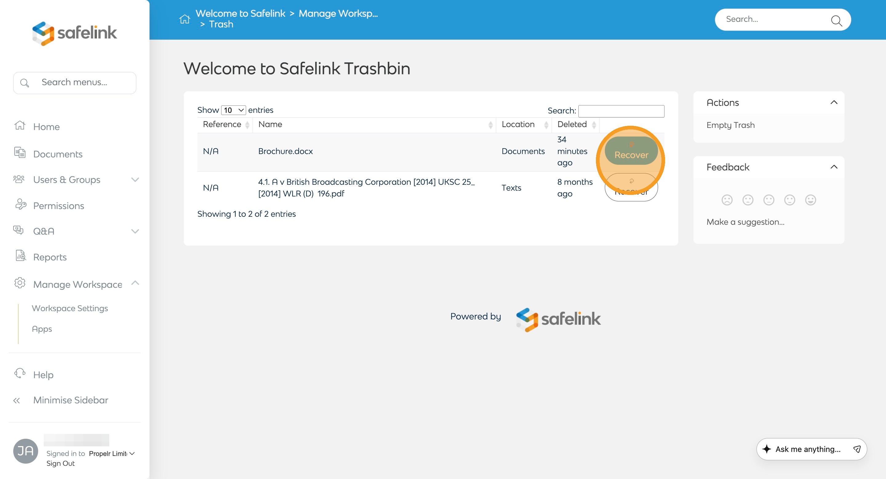 - Locate the file you want to restore and click Recover.