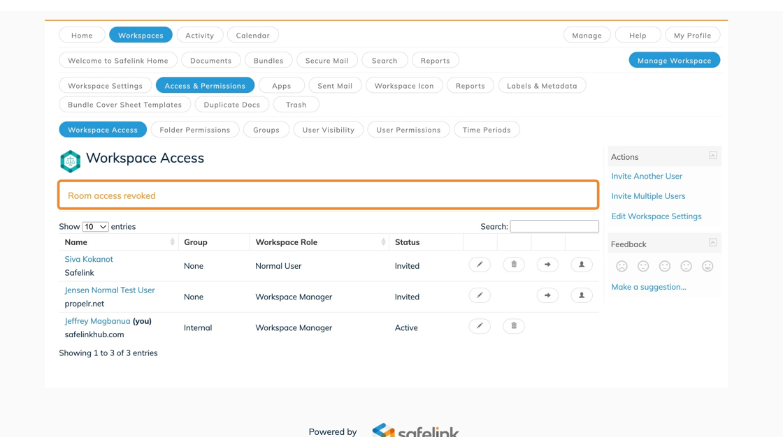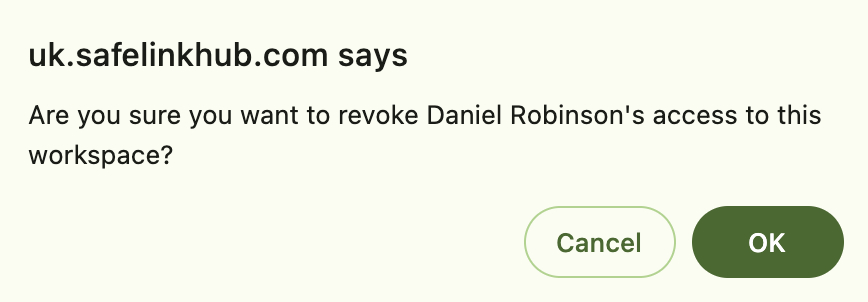 This user will no longer be able to access this workspace. However, removing a user from a workspace does not remove them from the Safelink System.