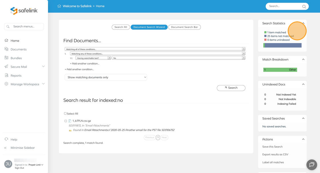 - When the system has finished searching the room, it will display all the documents matching your search criteria in the Search Results. The Search Statistics are displayed in the right-side panel.