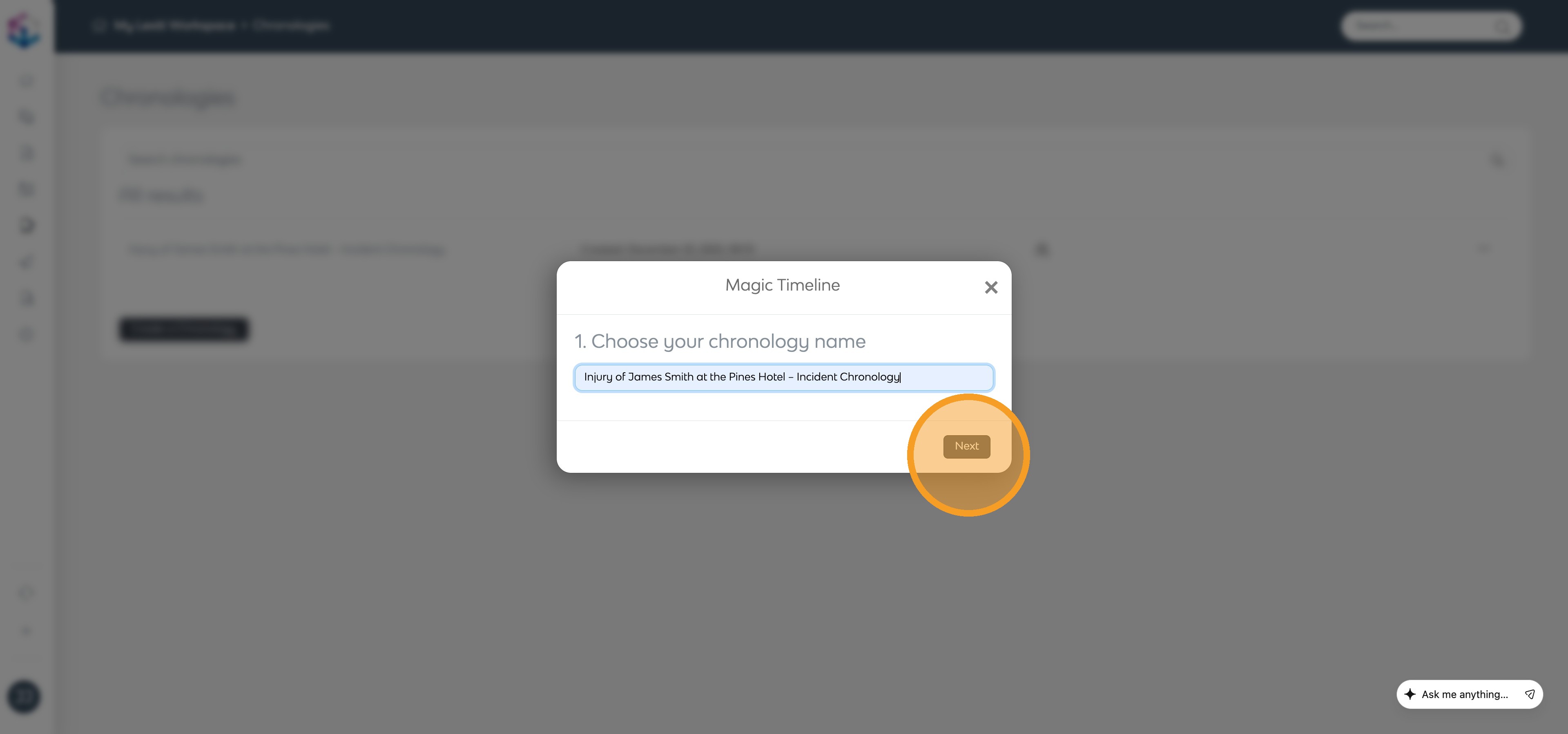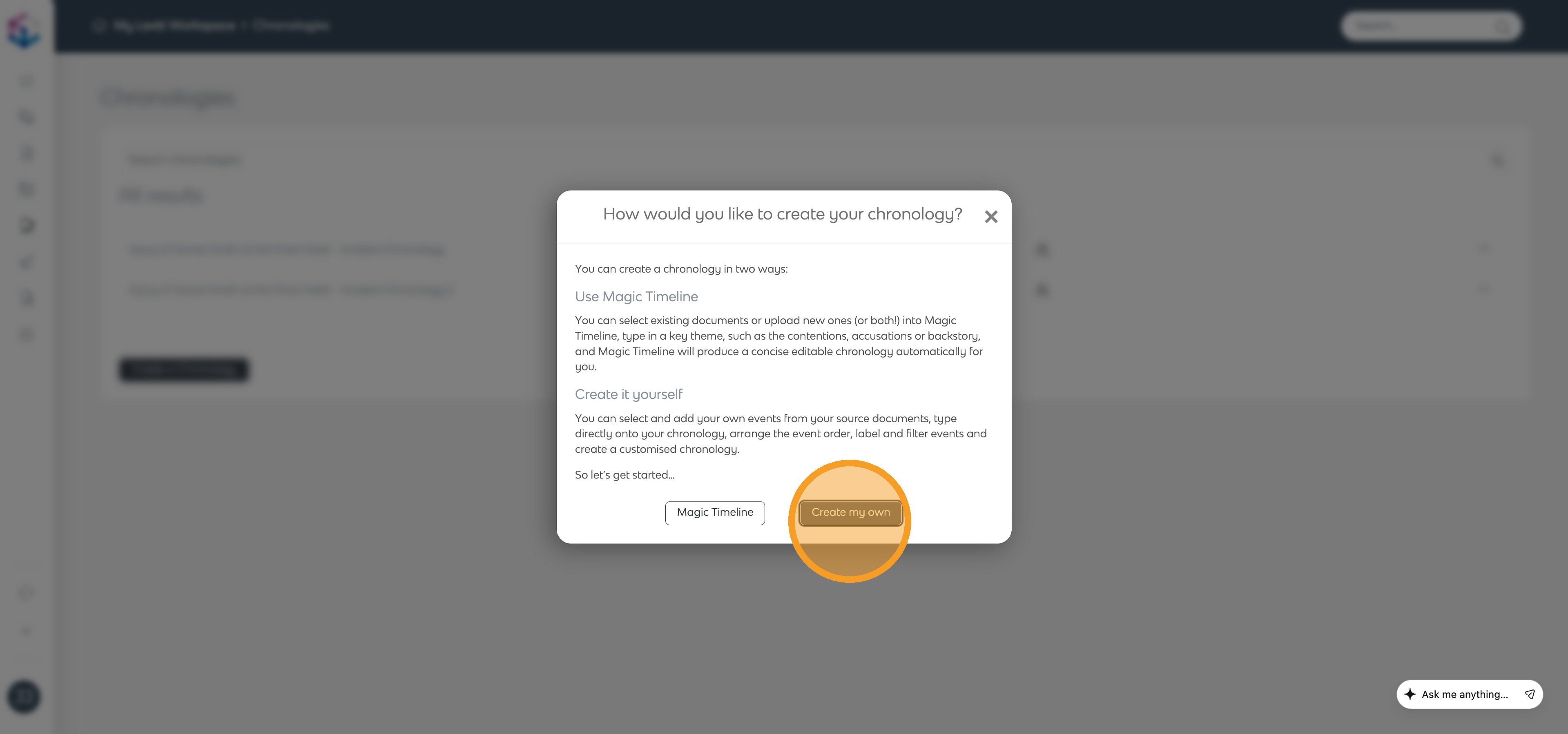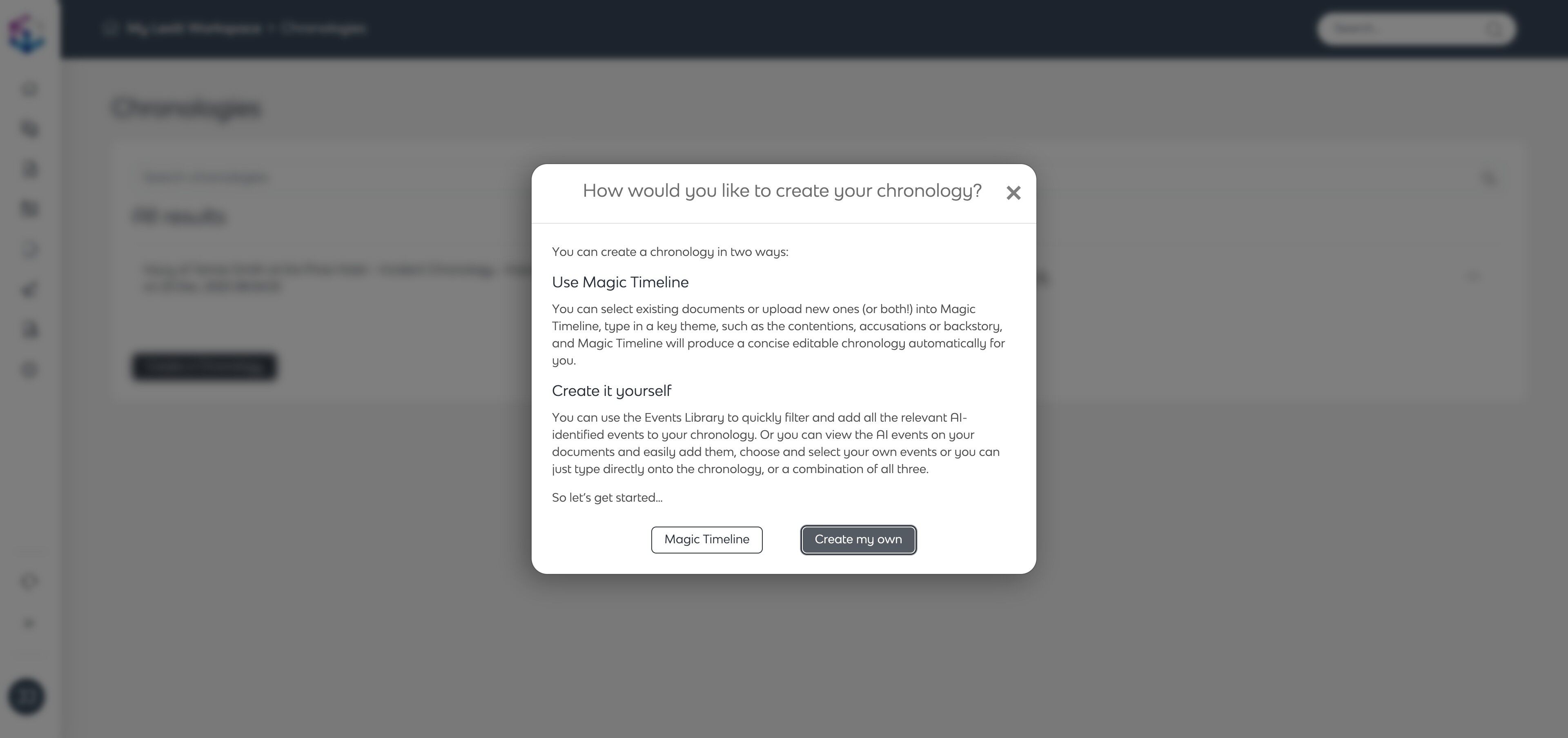 You can create a chronology automatically with Magic Timeline or build it manually by adding each event yourself. Select Magic Timeline to create your chronology automatically.