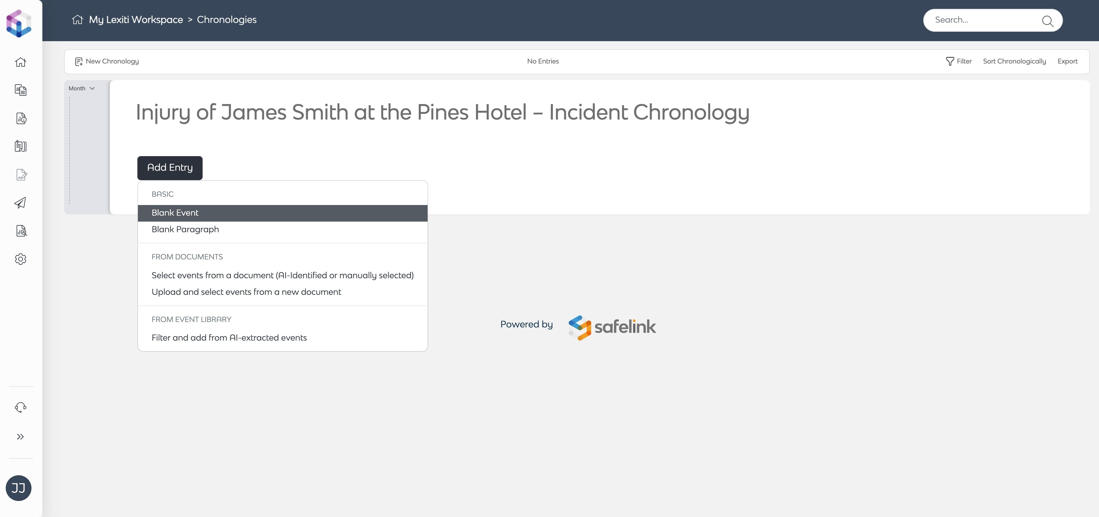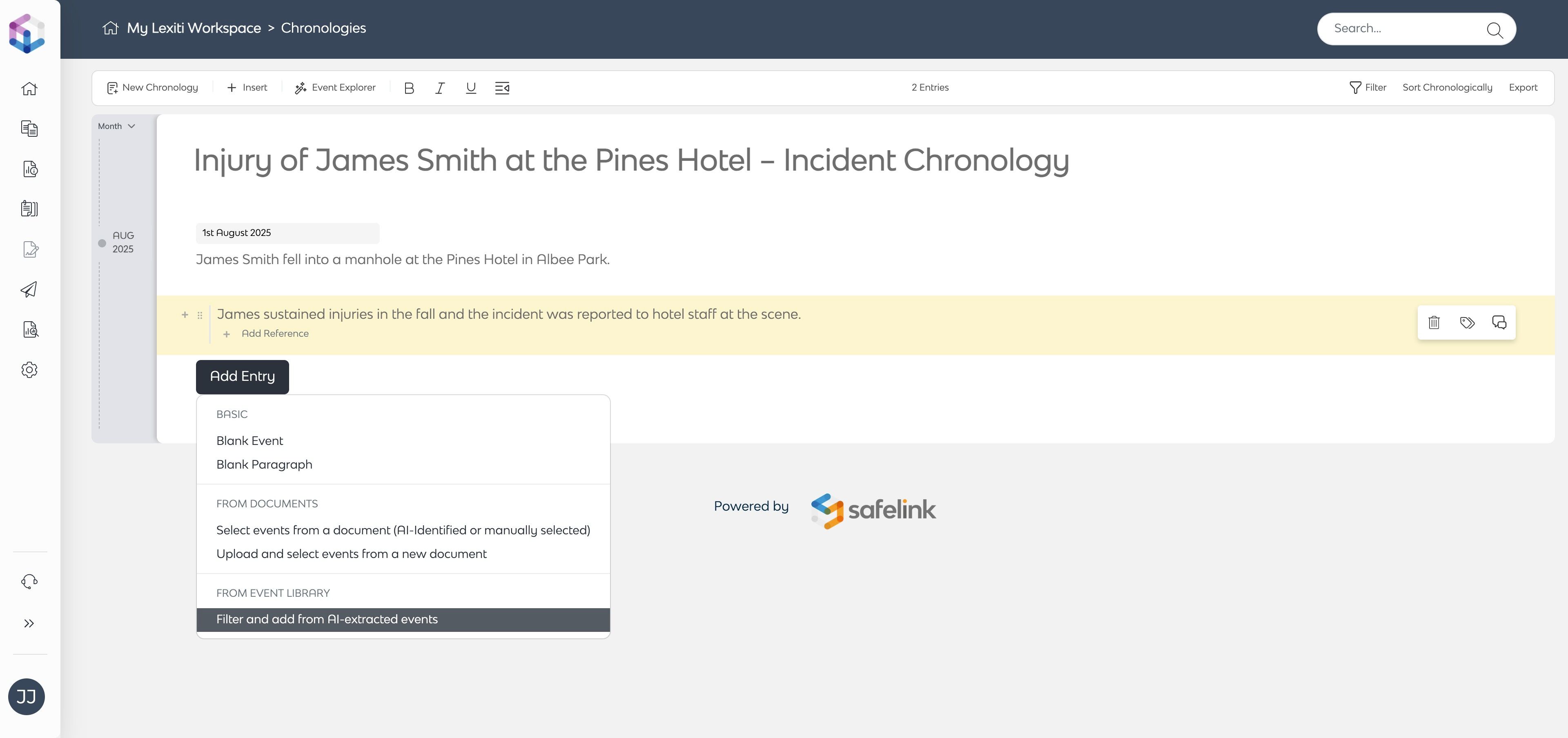 Click Add Entry and select Filter and add from AI-extracted events to open the Events Library. The Events Library is a collection of AI-extracted event entries you can add to your chronology.