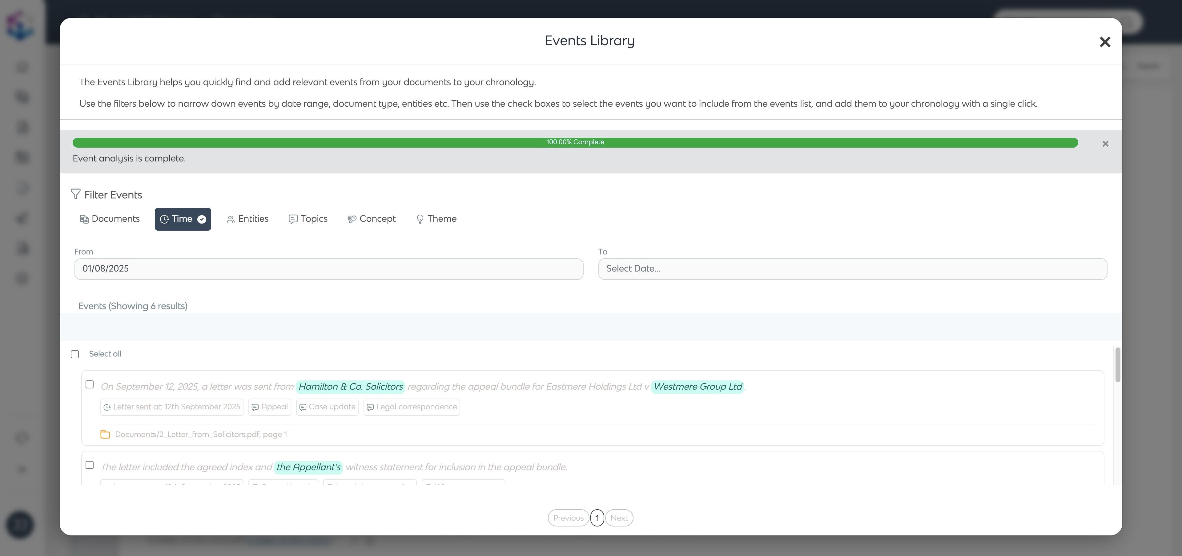 The Events Explorer modal will open with automatically extracted events. The events will appear as they are processed. You can filter the events by Documents, Time, Entities, Topics, Concept or Theme.