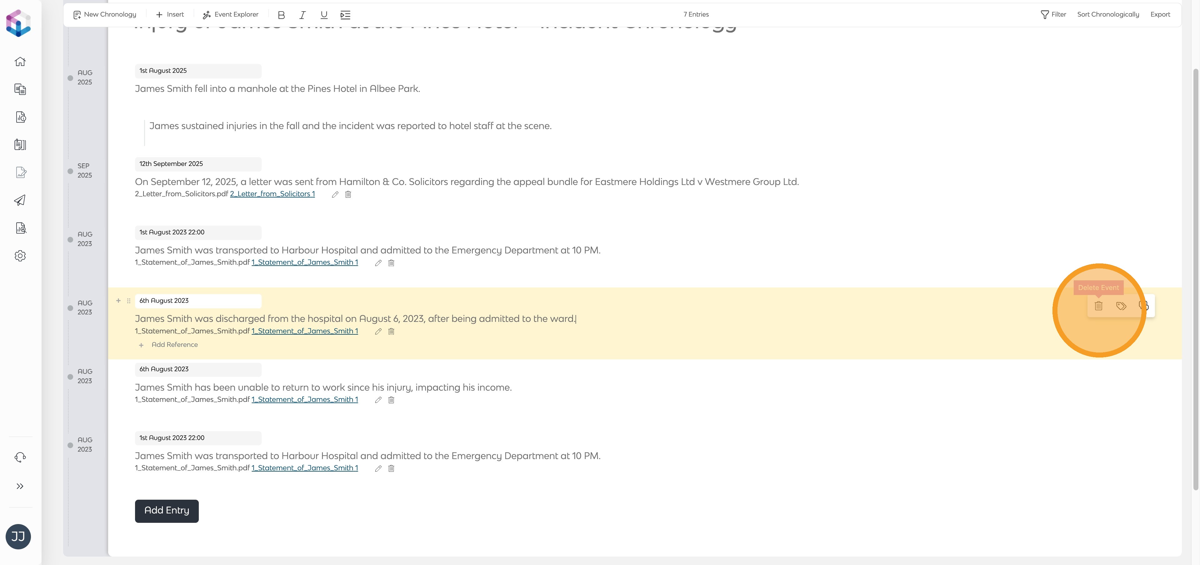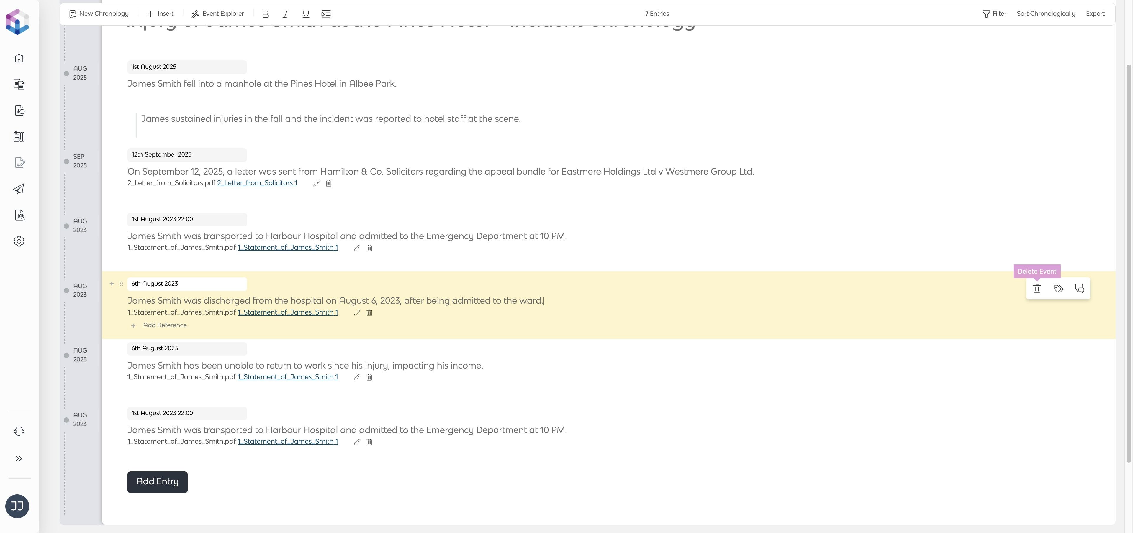 Once event extraction is complete, the system will open your Chronology. You can review, add, or remove events as needed.