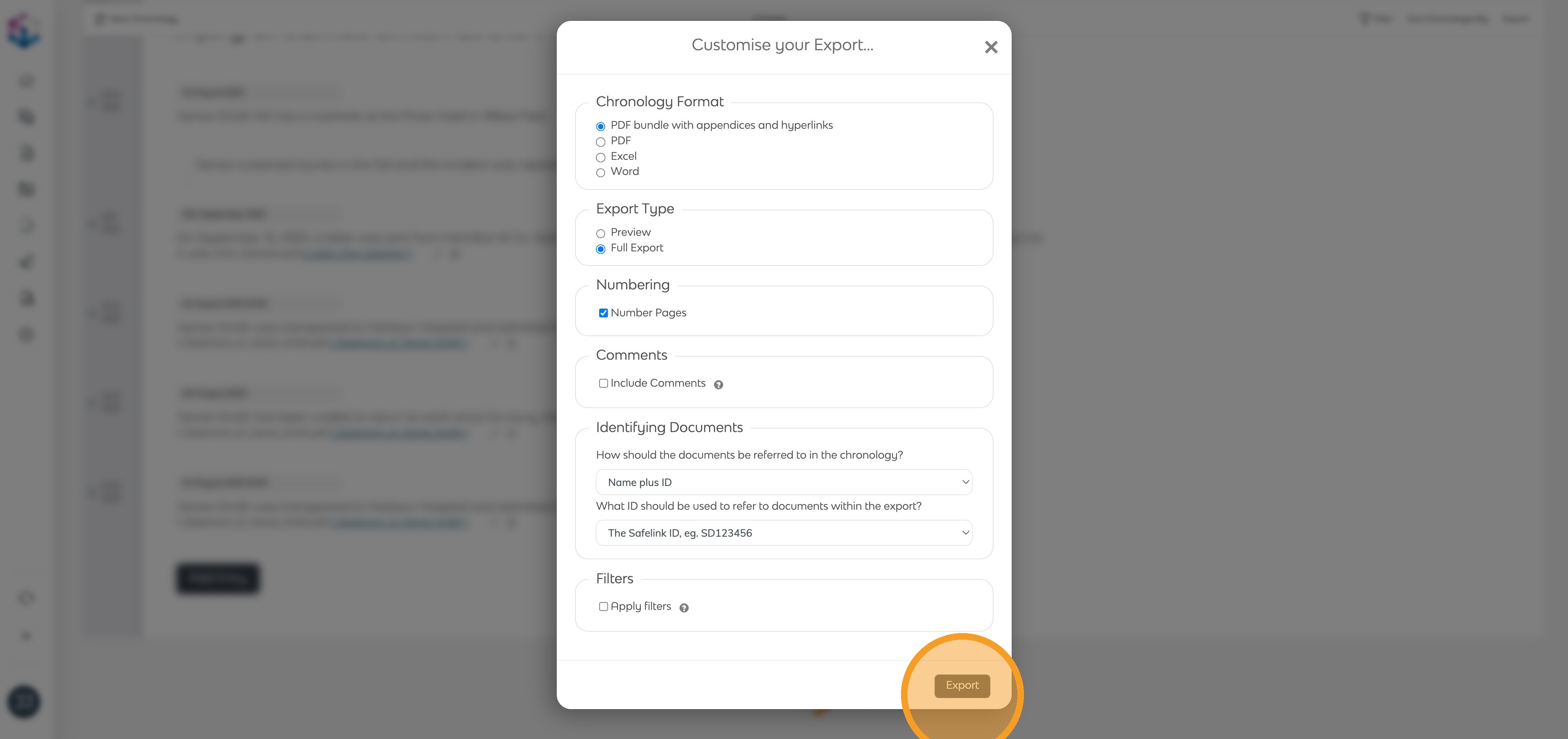 Export - Click Export to begin exporting your chronology.