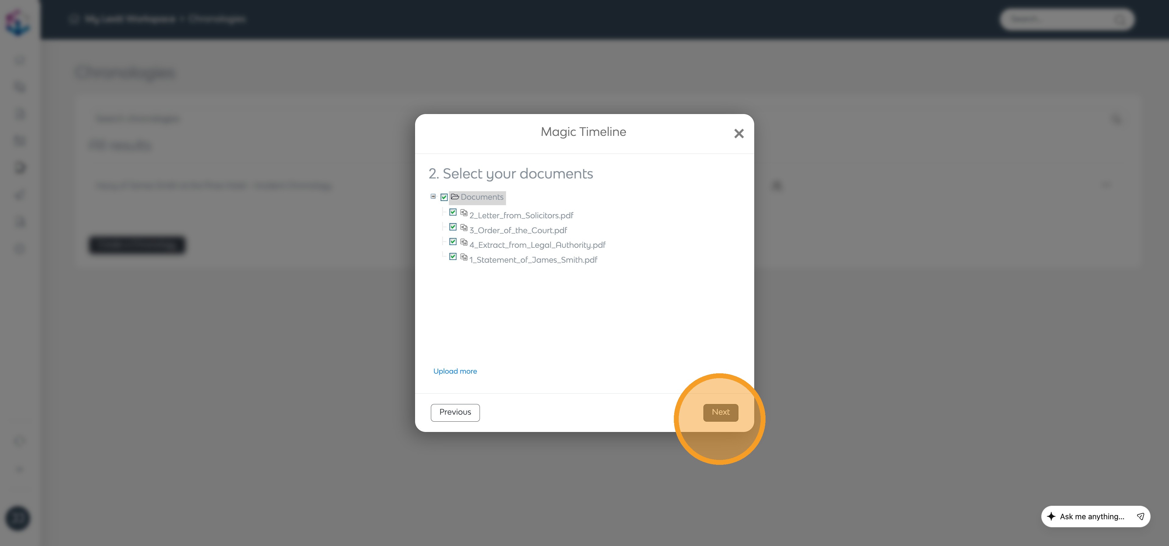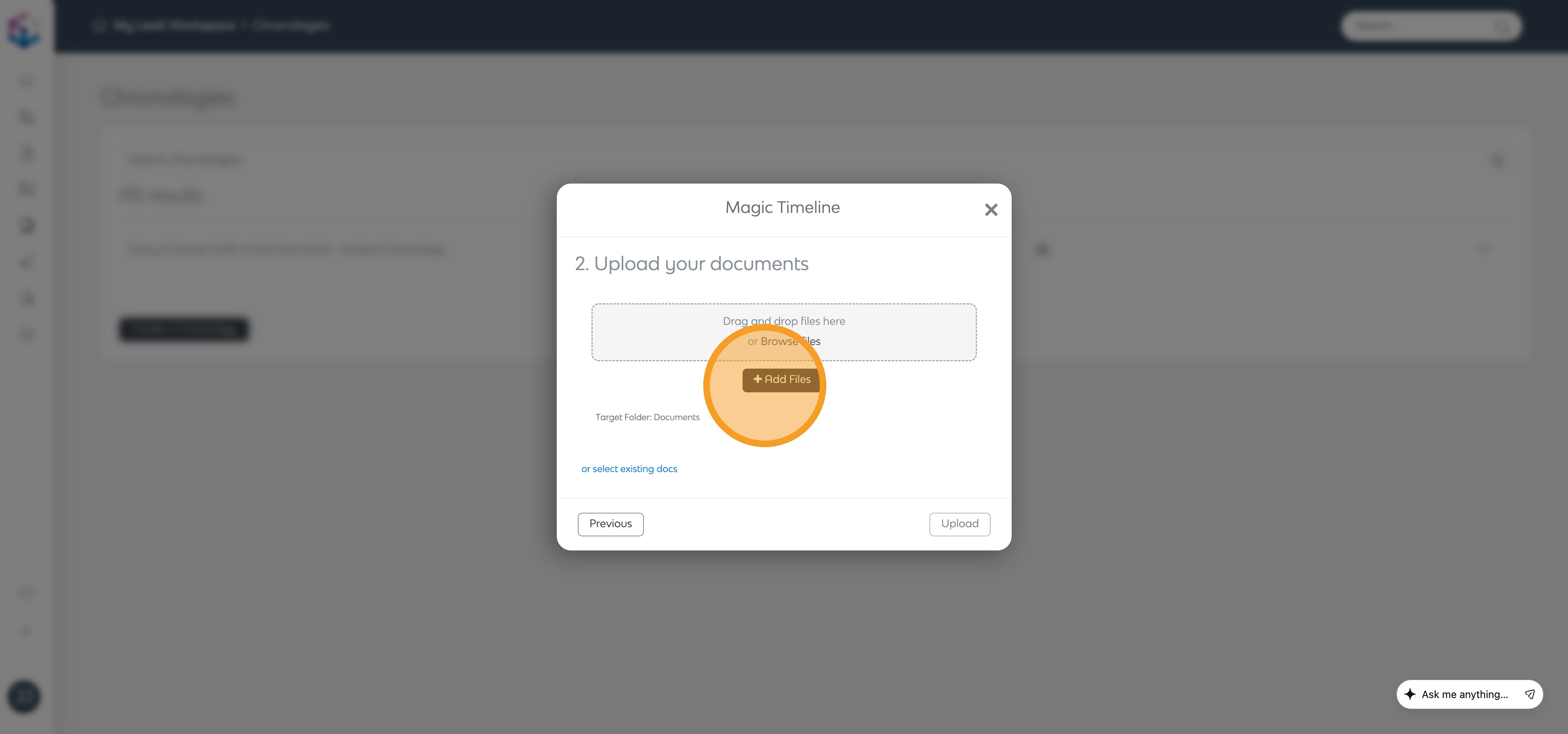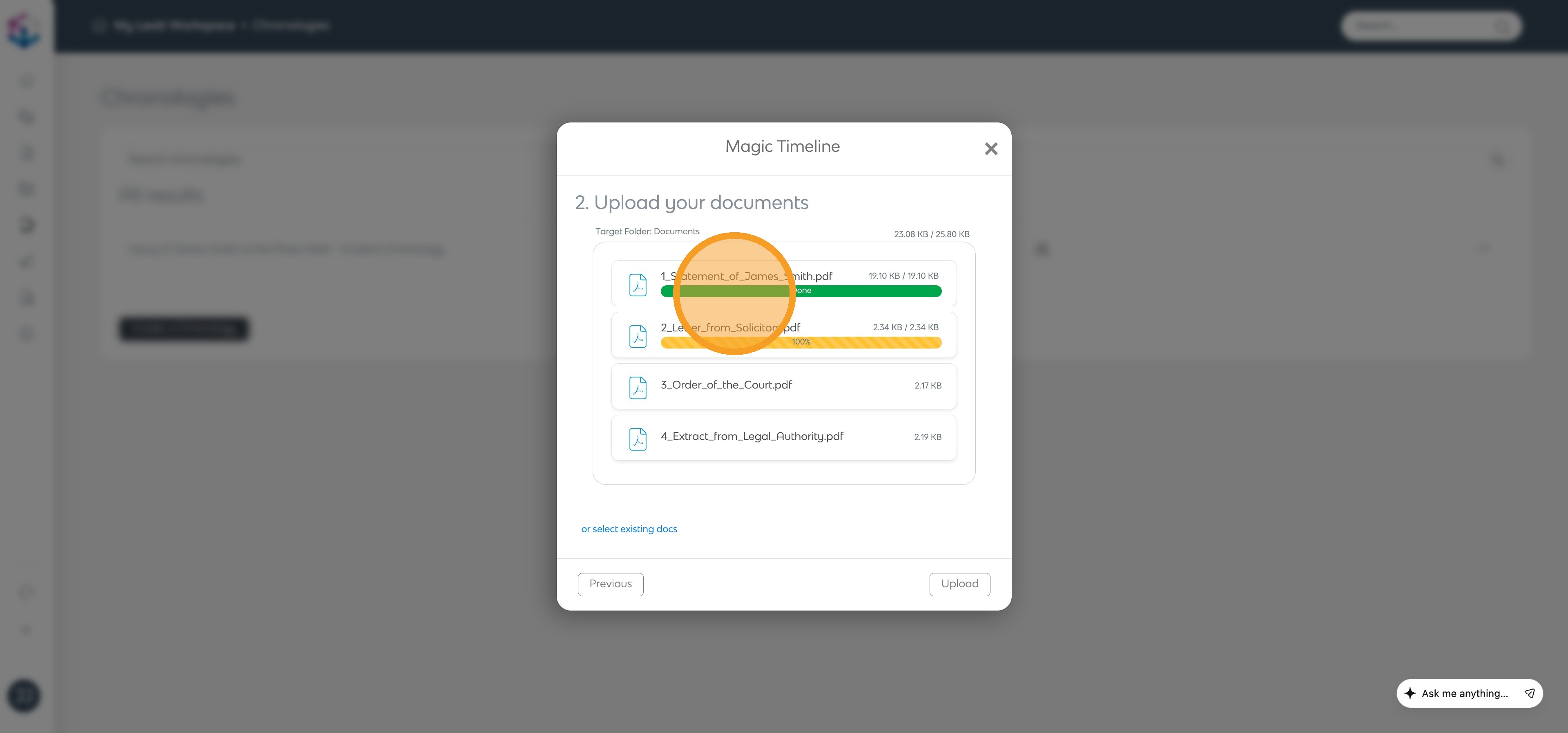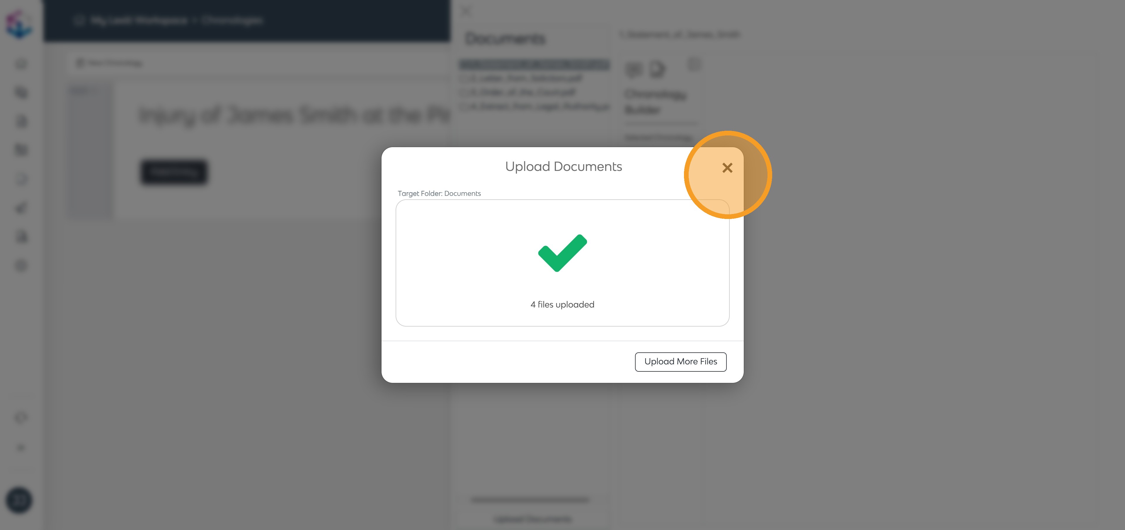 Once uploaded, your documents will be processed automatically. Click X to return to your chronology.