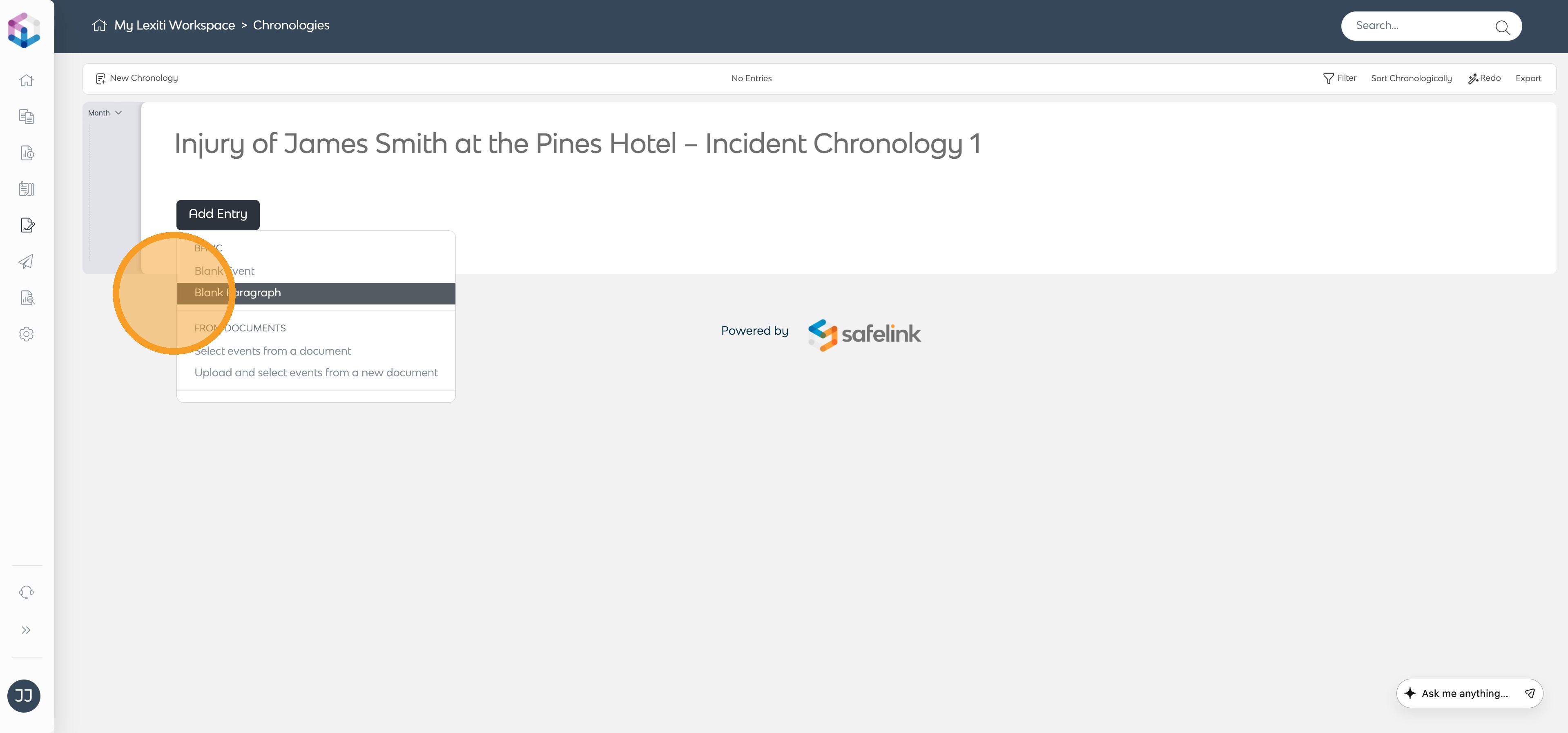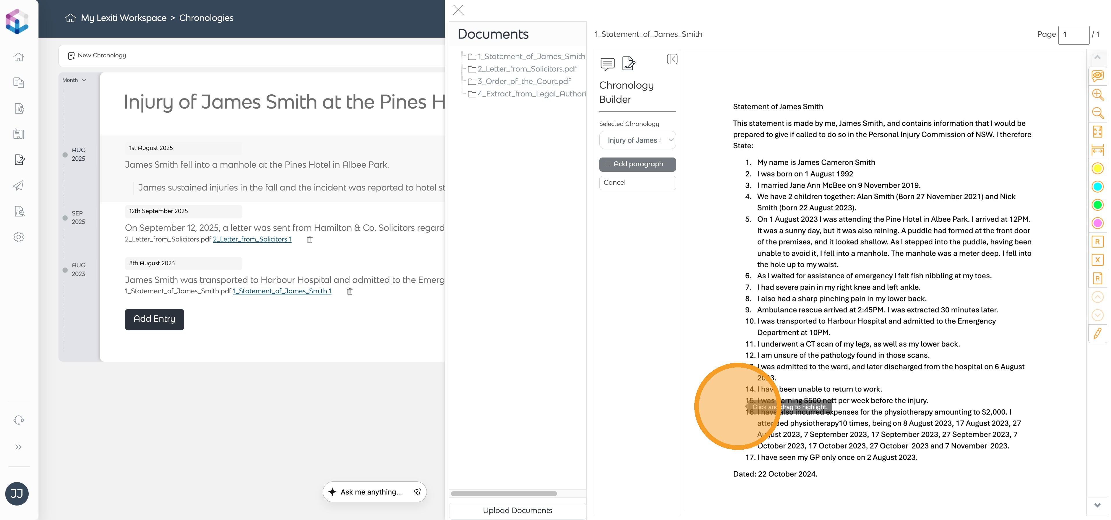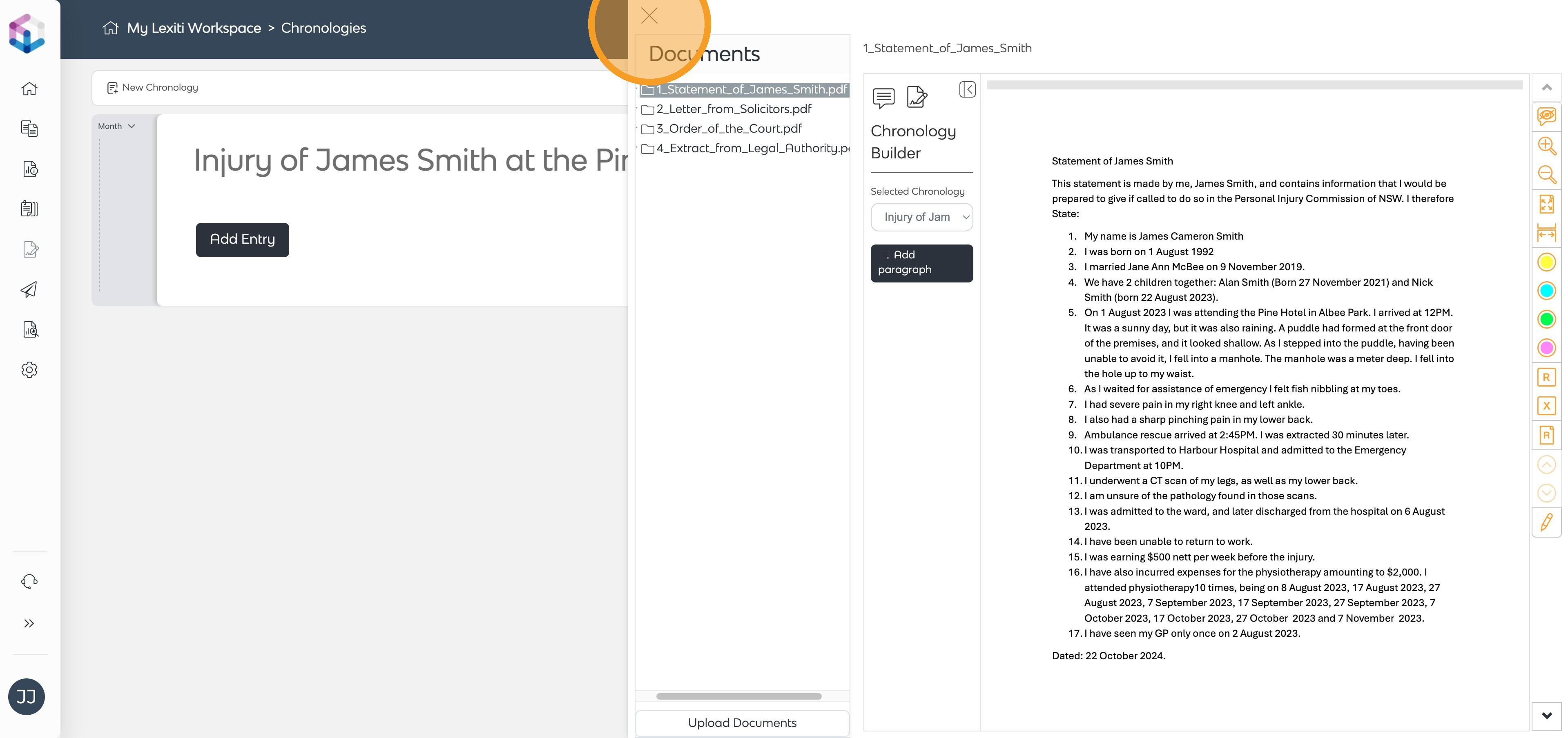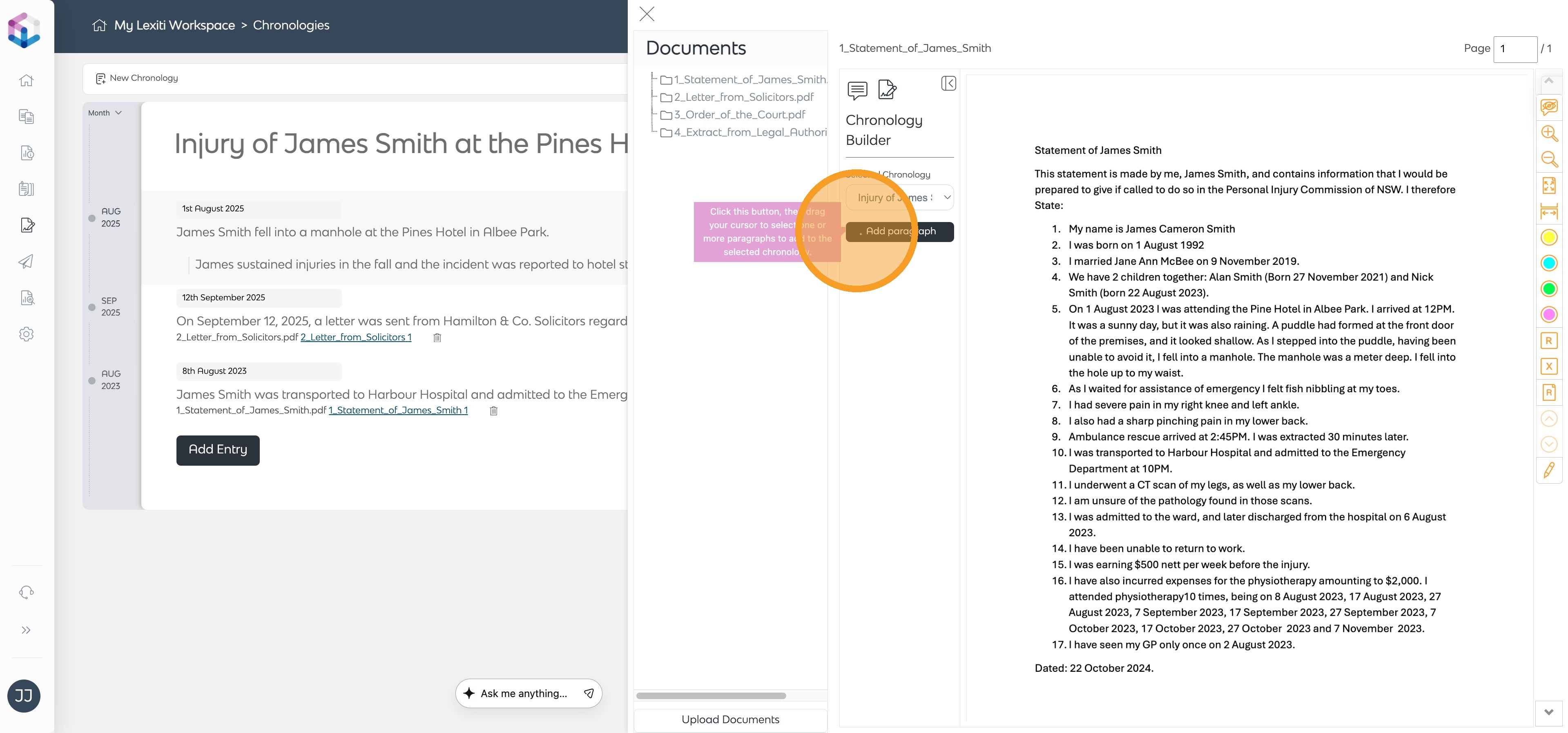 - Open the relevant document and click Add Paragraph in the Chronology Builder panel.