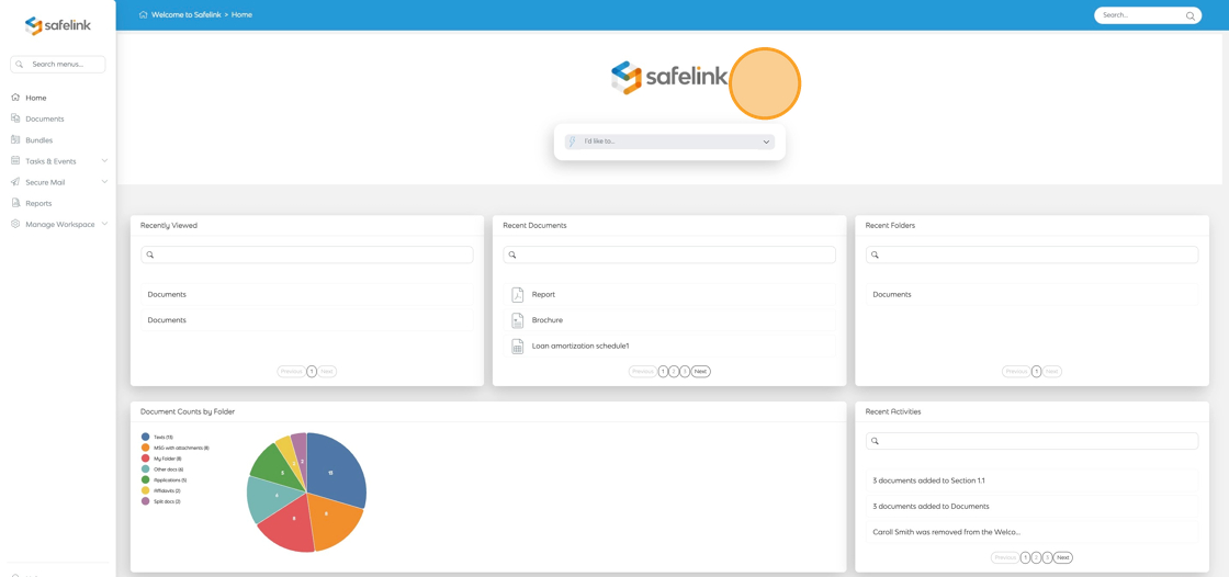 - You can also modify the look of your workspace homepage to help users quickly send secure mail or navigate to the Documents Area.