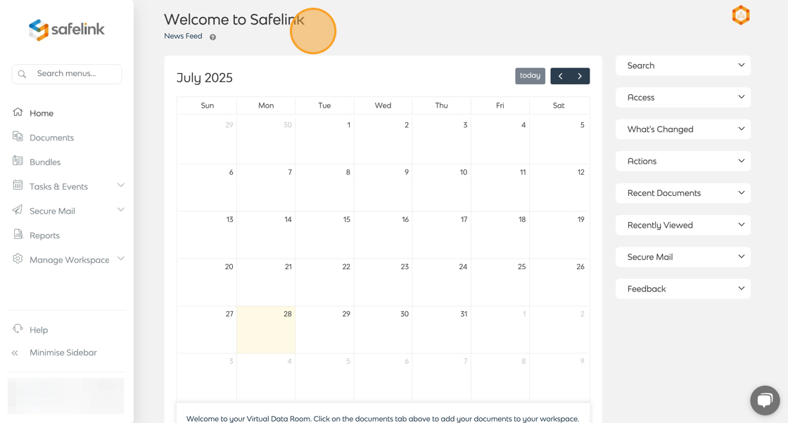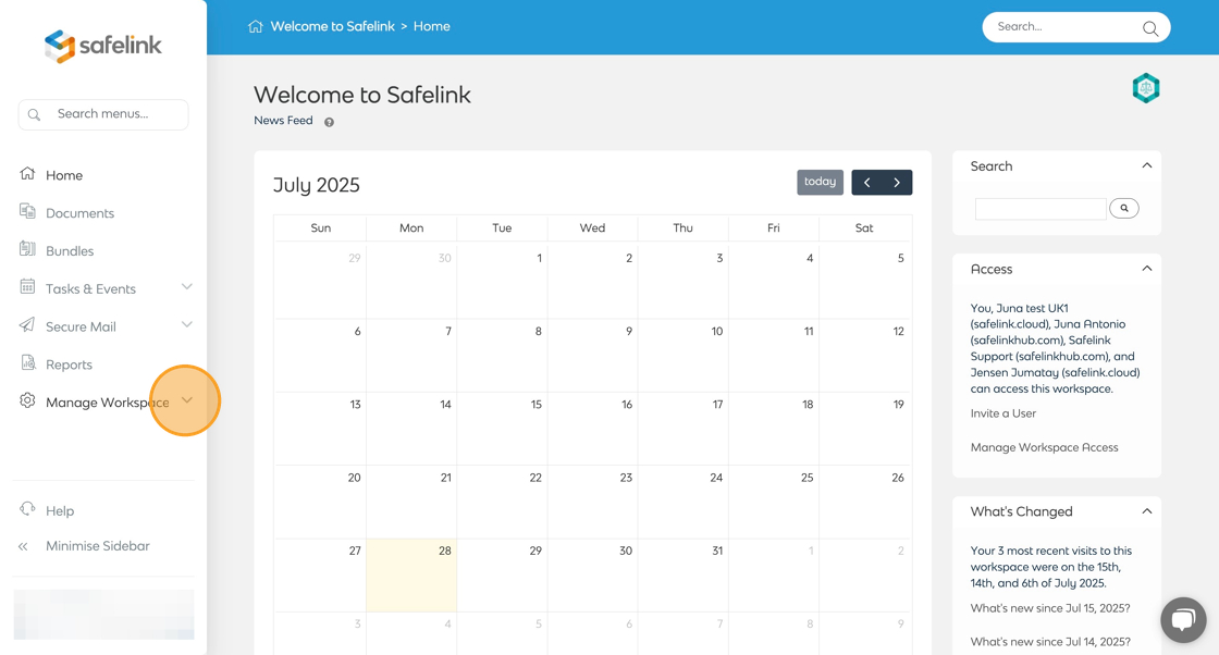 - By default, users will arrive here, the workspace homepage. The Workspace homepage can display a calendar and show the news feed, which displays new documents, messages and tasks.