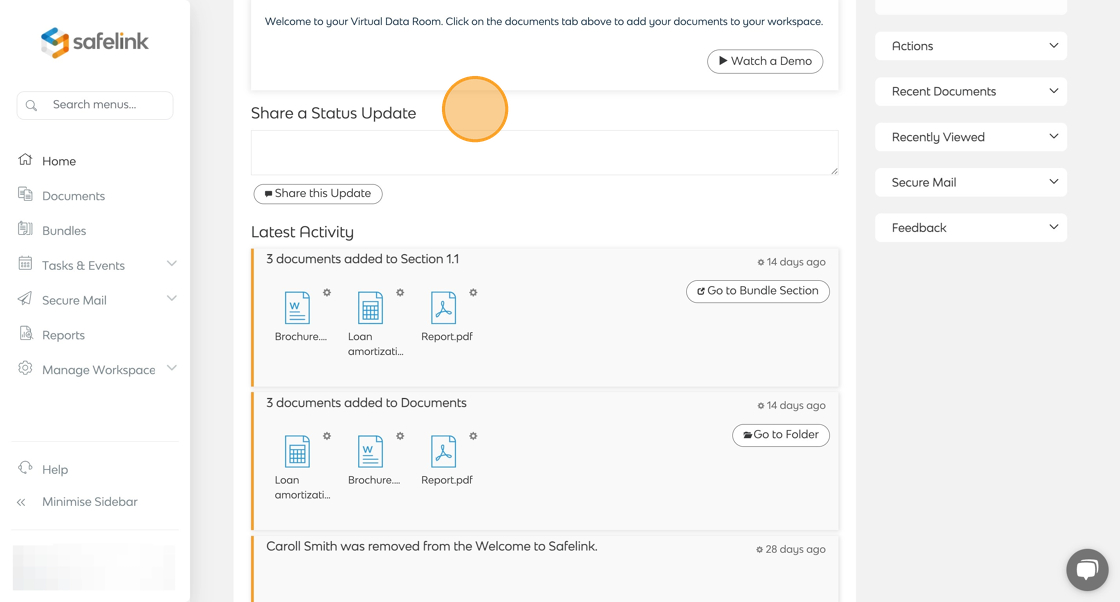 - You can set the Documents Area as your workspace landing page. This will remove the ability for users to access the workspace homepage.